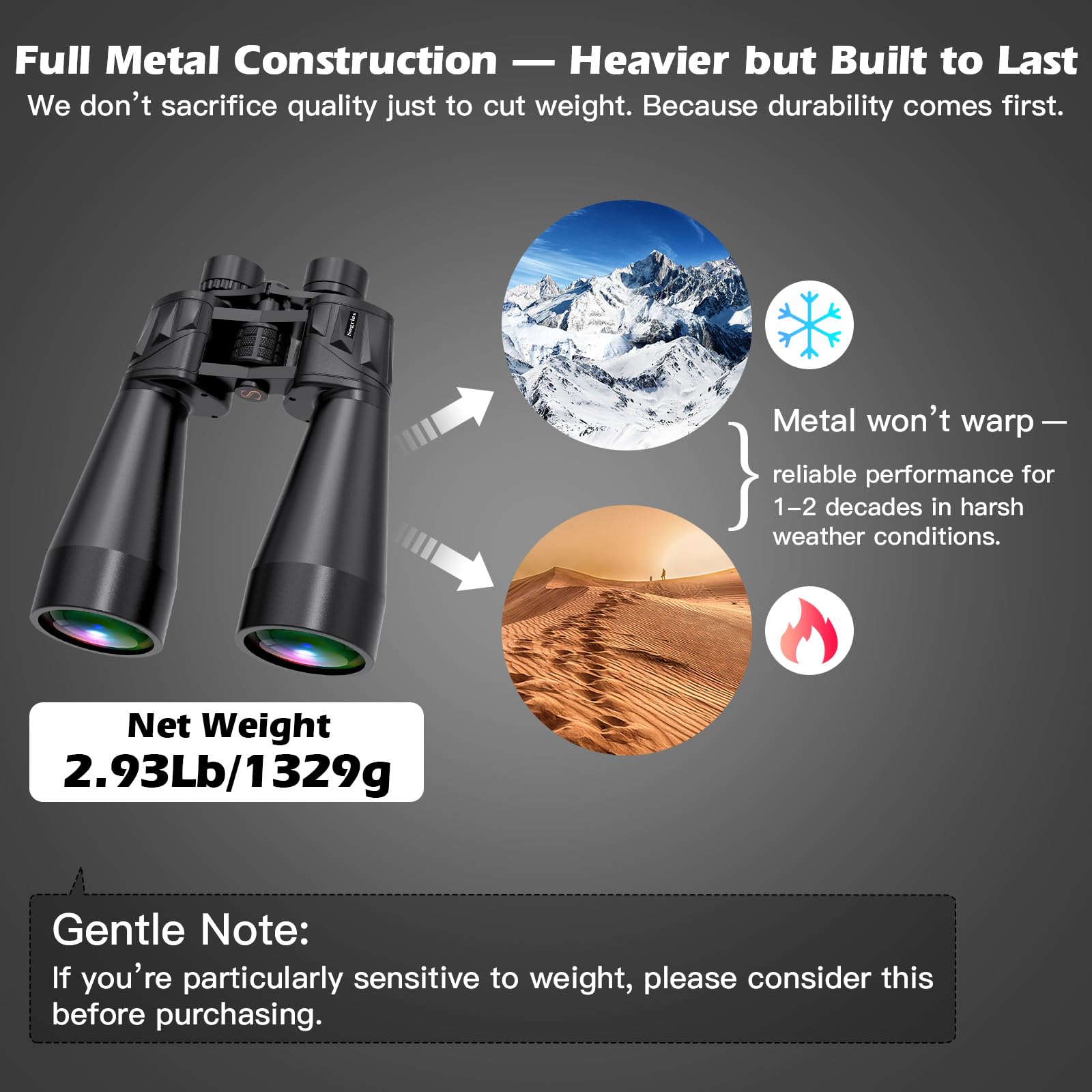 - WEIGHT REMINDER---Our binoculars for adults high powered design requires a metal barrel to ensure stability, and it is recommended to use a tripod (not portable). Additional purchase: B0D9TK1D64.