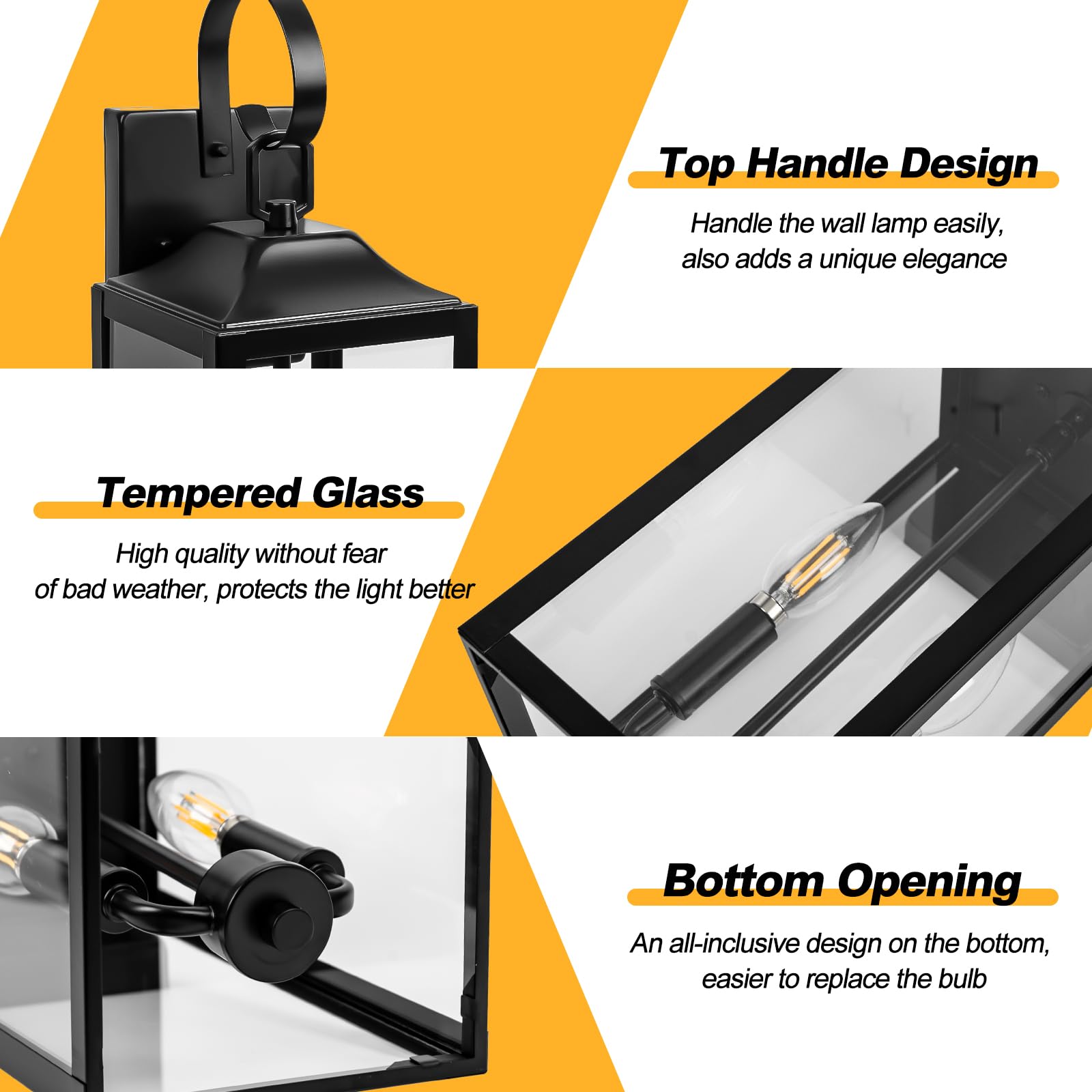 - Classic & Practical Design: This large porch light features 4 clear glass panes, which can emit bright light and illuminate the place at maximum, creating a beautiful lighting atmosphere outside or inside your home. The design of the top handle makes wall light fixture look less rigid and add a modern flair. The outdoor wall light is open at the bottom for easy light cleaning and bulb replacement. The clear lamp shade can showcase your bulb of choice to create a stunning light outside your home.