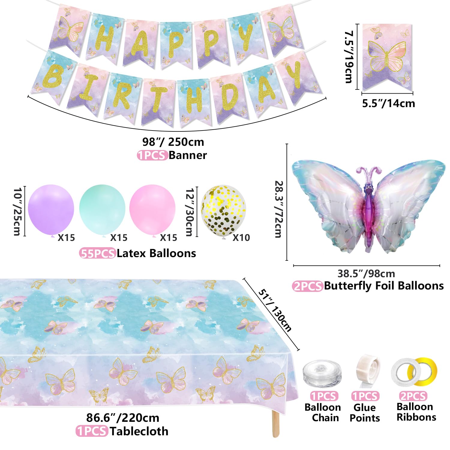 - Easy to Use - These birthday party decorations are equipped with ribbons and glue points to help you make the colorful balloon arch more easily and quickly saving time and effort. The banner comes ready to hang, and no assembly requires. Besides, the butterfly tableware set and tablecloth need no washing up, you can throw them away after the butterfly party, allowing you to enjoy more party time!
