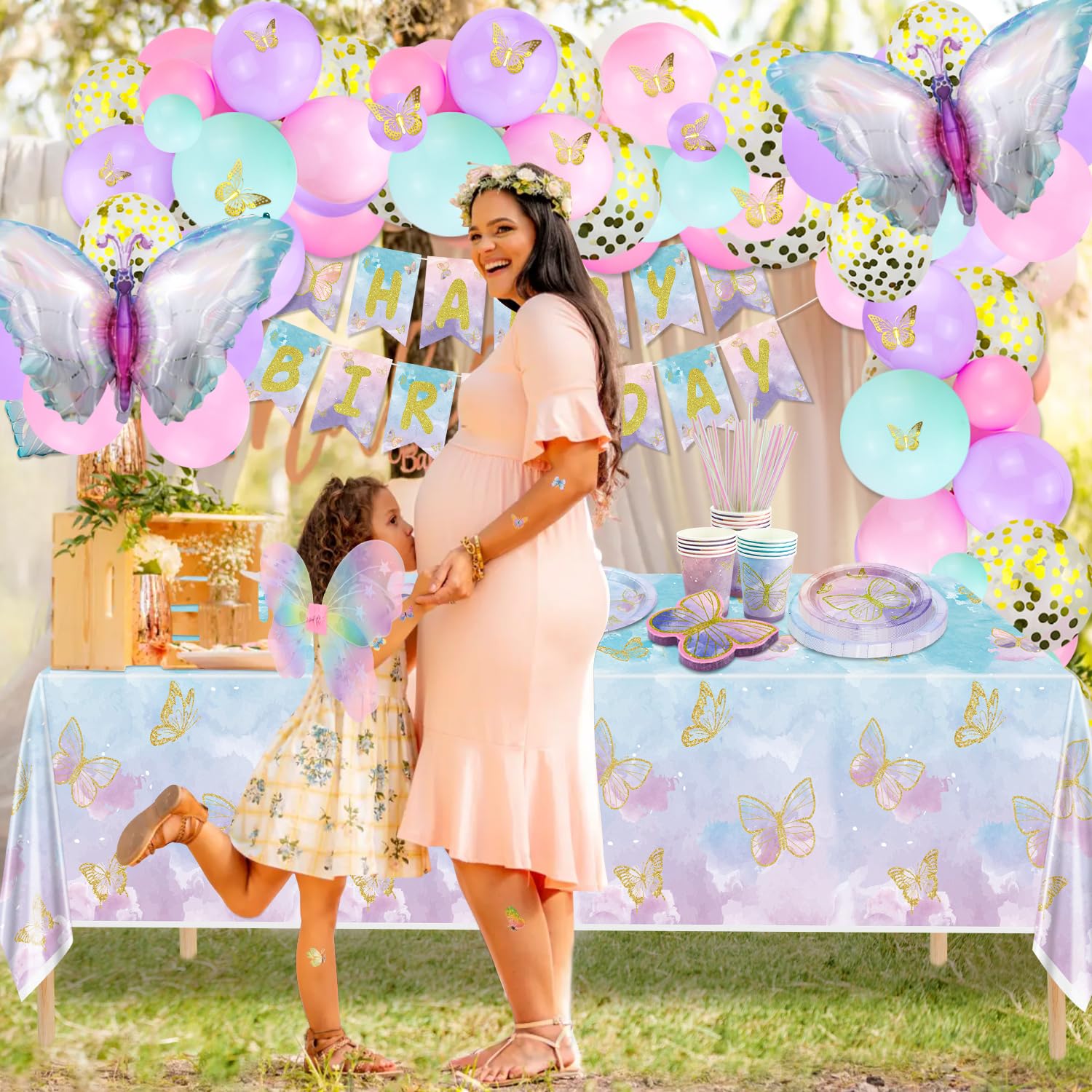 196 Pcs Butterfly Party Decorations - Including Plates, Tablecloth, Balloons, Banner, Butterfly Stickers, Cups, Fairy Wing Set for Princess Fairy Birthday Decorations, Fairy Party Supplies