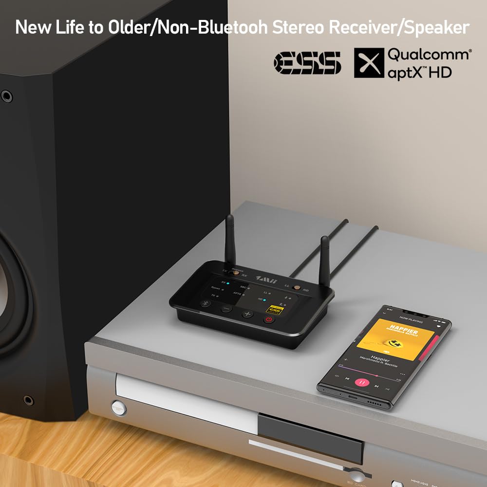 - 【Bluetooth 5.3】Featuring the latest Bluetooth 5.3 and support for Qulacomm aptX Adaptive, aptX Low Latency, aptX HD,aptX and AAC decoding. Simple switch to alternate between HD and low latency priority If your device supports both codecs,Note: AAC is only available in receiver mode.