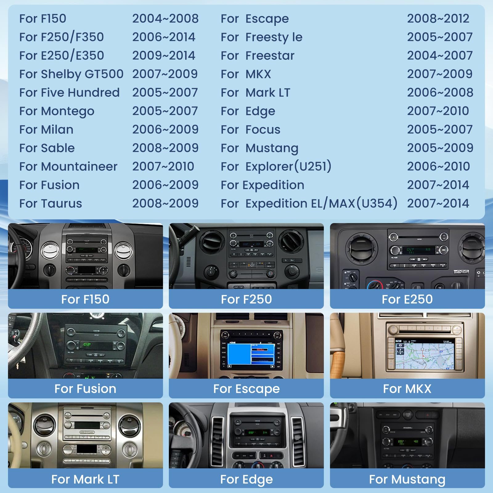 - 4-Core 2+64G Applicable Models: for F150 (04-08), for F250/F350 (06-14), for E250/E350 (09-14), for Shelby GT500 (07-09), for Five Hundred (05-07), for Montego (05-07), for Milan (06-09), for Sable (08-09), for Mountaineer (07-10), for Fusion (06-09), for Taurus (08-09), for Escape (08-12), for Freestyle (05-07), for Freestar (04-07), for MKX (07-09), for Mark LT 06-08, for Edge 07-10, for Focus (05-07), for Mustang (05-09), for Explorer(U251) 06-10, for Expedition (07-14), for Expedition EL/MAX(U354) (07-14)—Please note that the third picture has an example that does not fit.