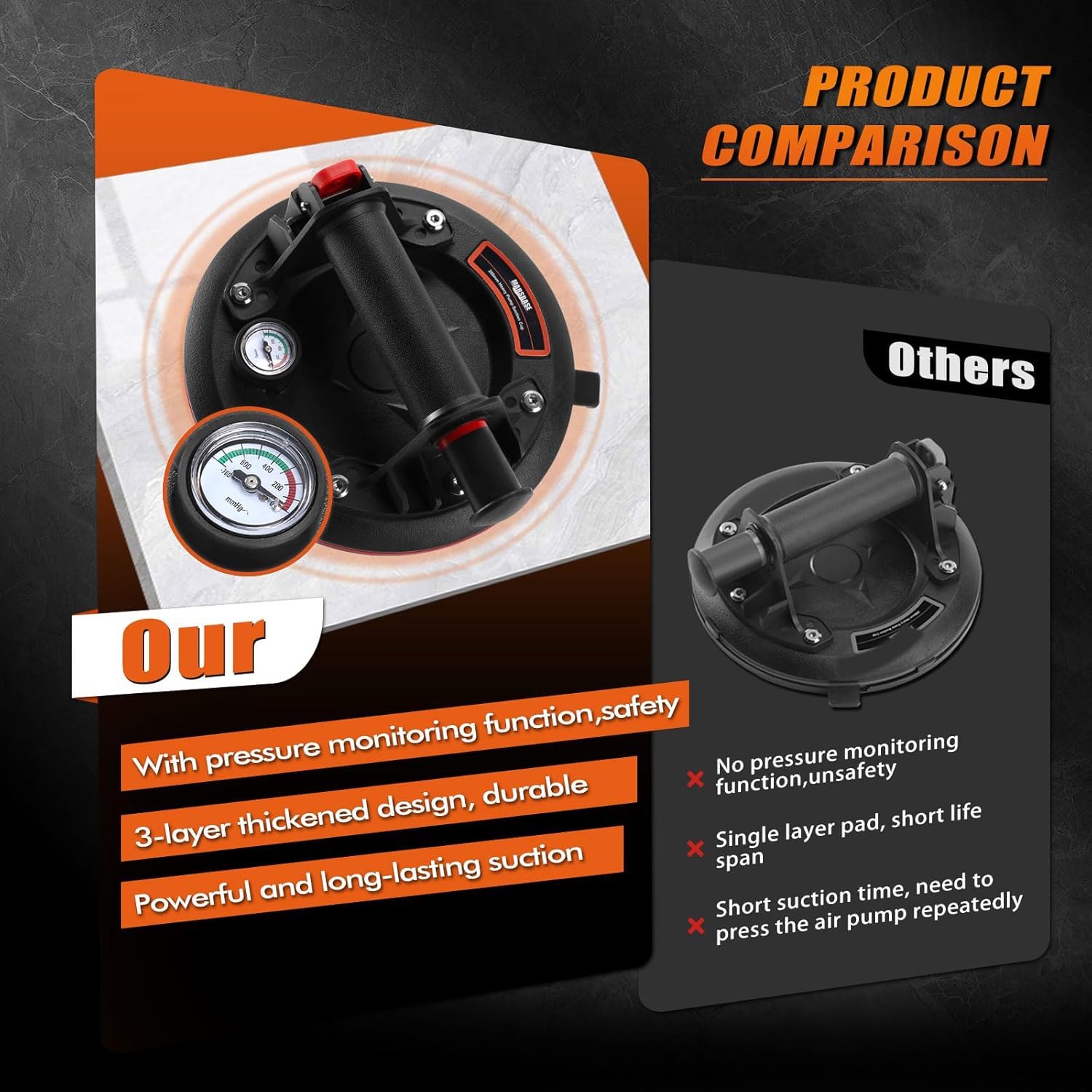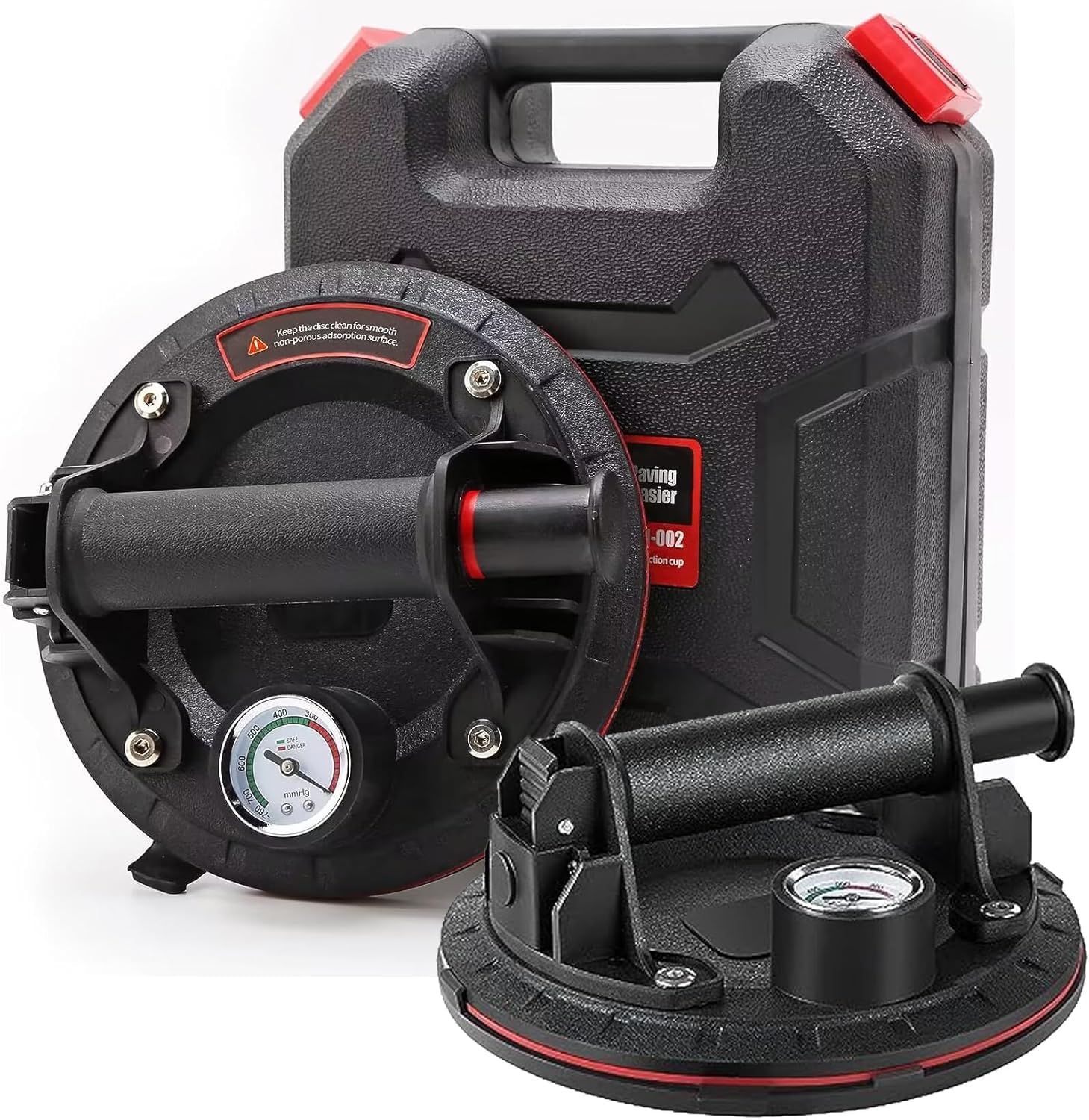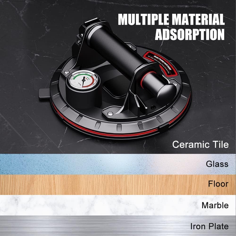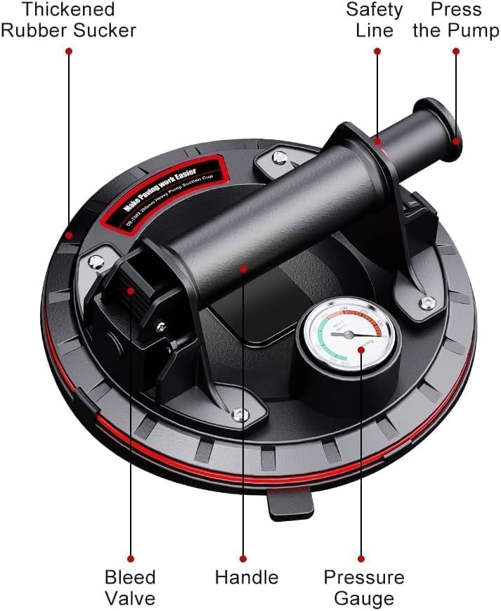 - 【With Pressure Gauge, Safe To Use】The plunger uses a red line indicator to let you know you have enough vacuum to lift your load. Press the air pump until the pointer of the barometer is in the green area, so the suction cup can completely fit the surface and maintain the suction force for more than 8 hours. After use, press the exhaust valve to release. When the red line appears while lifting, simply thumb pump the plunger without removing the cup from the surfaces