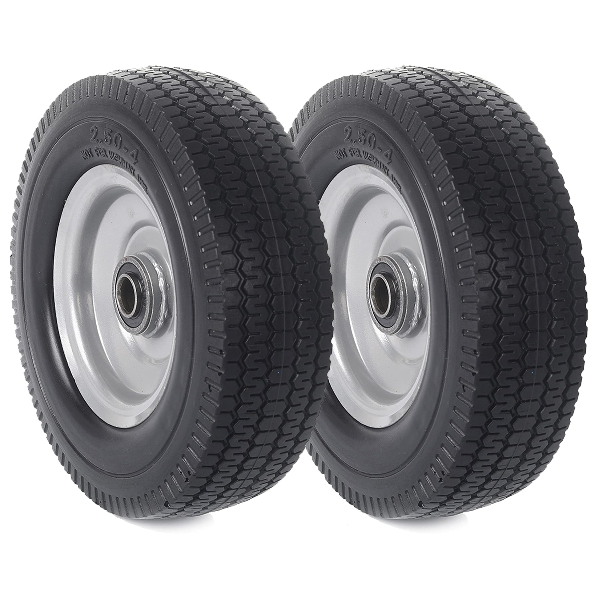 - 5/8” AXLE BOREHOLE, 2 1/4” OFFSET HUB, AND DOUBLE-SEALED BALL BEARINGS - Don’t let the thought of replacing an entire wheel assembly deter you from enjoying the benefits of a flat-free and tubeless hand truck wheel. The wheel assembly has an axle borehole inner diameter of 5/8 inch that will universally fit on 5/8-inch axles. A 2 1/4-inch offset on the hub is often seen on garden carts, hand trucks, and lawn tractor wheels.