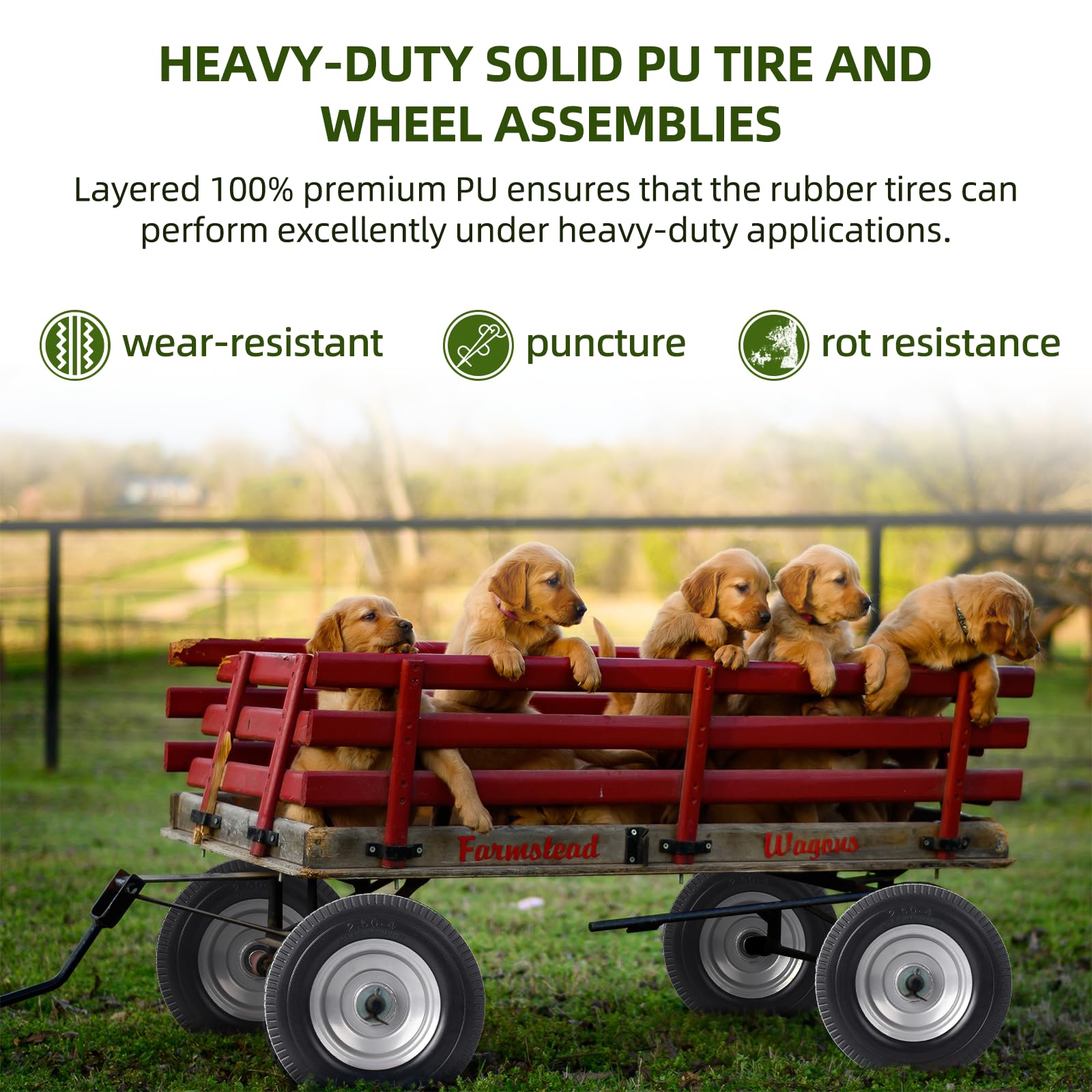 - HEAVY-DUTY SOLID PU TIRE AND WHEEL ASSEMBLIES - The layered 100% premium PU ensures that the rubber tires can perform excellently under heavy-duty applications. The solid and durable construction ensures that the tires are puncture, tear, wear, and rot-resistant. The rims are steel with solid metal hubs that resist impact cracks and suitable for all-terrain use.