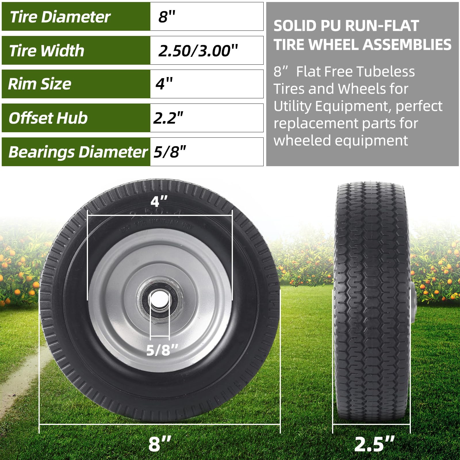 - 8” FLAT FREE TUBELESS TIRES AND WHEELS FOR UTILITY EQUIPMENT - Highly compatible with yard tractors, wagons, garden carts, hand trucks, portable generators, dollies, trolleys, pressure washers, and more! Convert now to more efficient and maintenance-free tire and wheel assemblies!