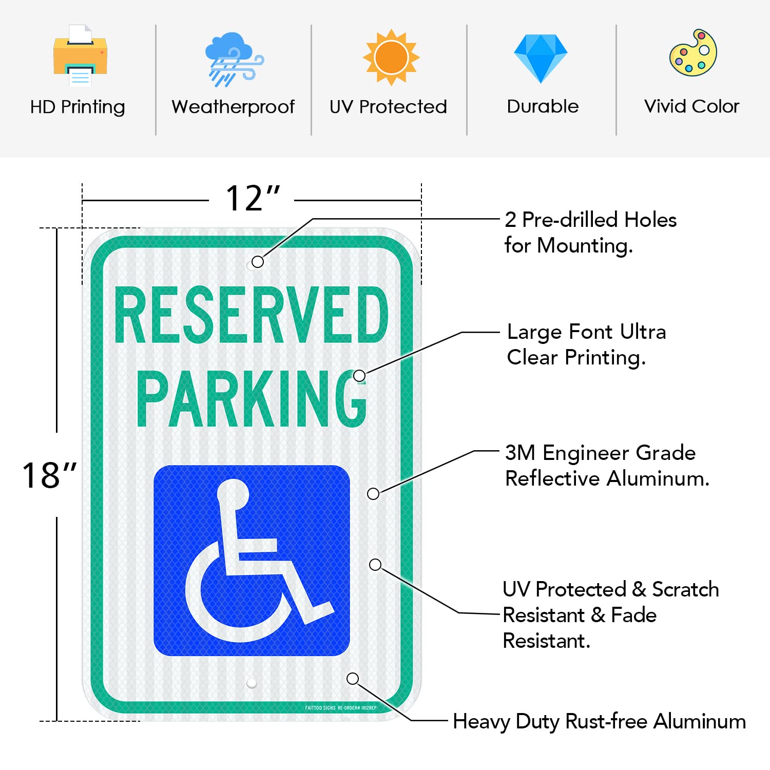 - "Reserved Parking Sign" High Contrast Blue Green on White design, mark handicap parking spaces.