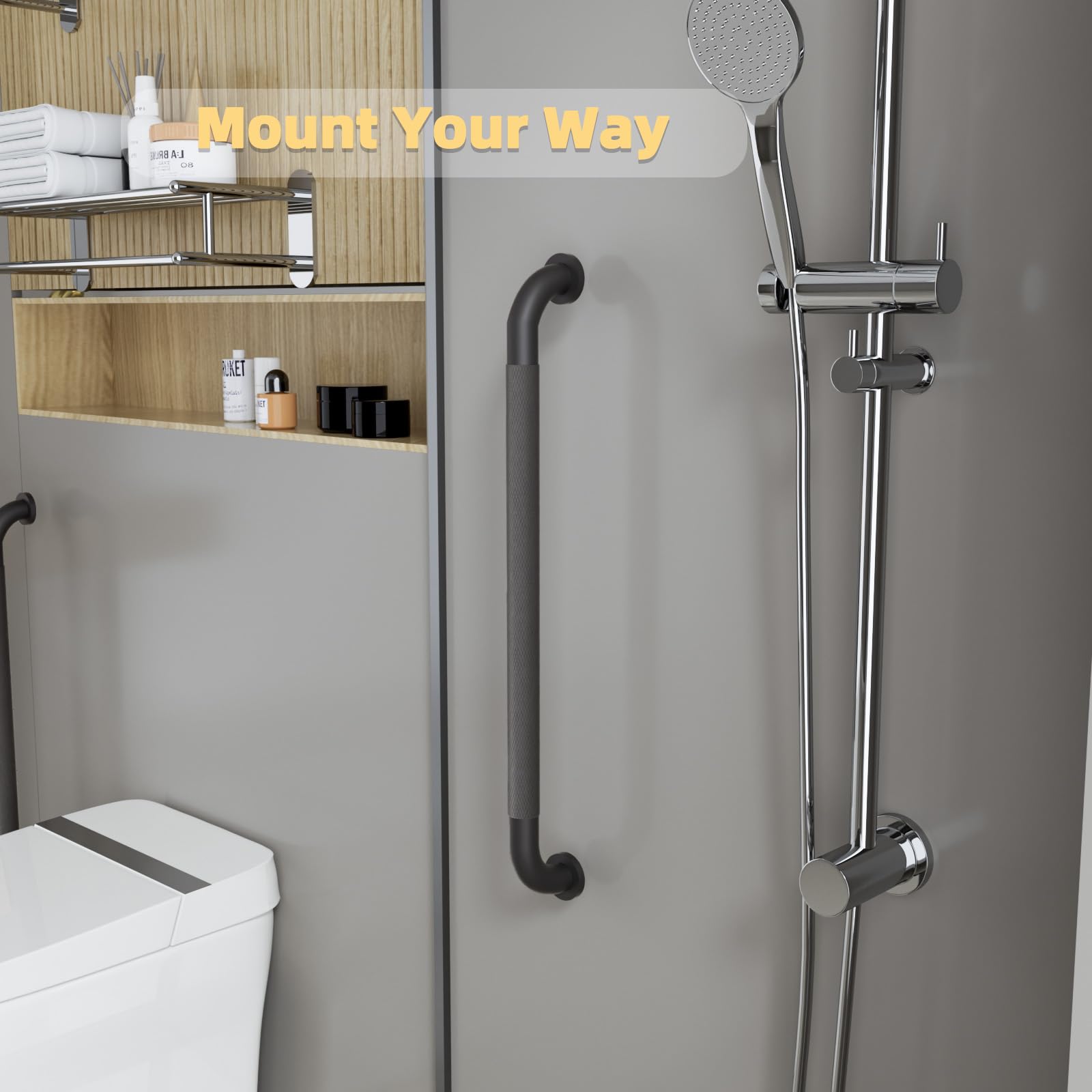 Designed with a sleek matte black finish and a classic knurled anti-slip surface,this heavy-duty grab bar adds both function and sophistication to any bathroom, garage, or doorway.