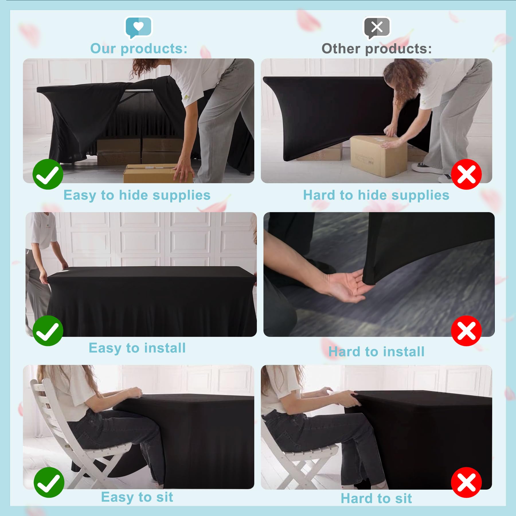 - 【Unique Design Spandex Table Cloth】 - 2-in-1 spandex table cloth - A black fitted table cover and table skirt combined in a single piece. Its unique fitted design ensures a perfect fit for desk and tables, while simultaneously functioning as an elegant table skirt to enhance the overall appearance of your banquet or event table. Our fitted tablecloth is specifically designed to save your time and simplify the decoration process, making banquette table decoration look elegant and neat.