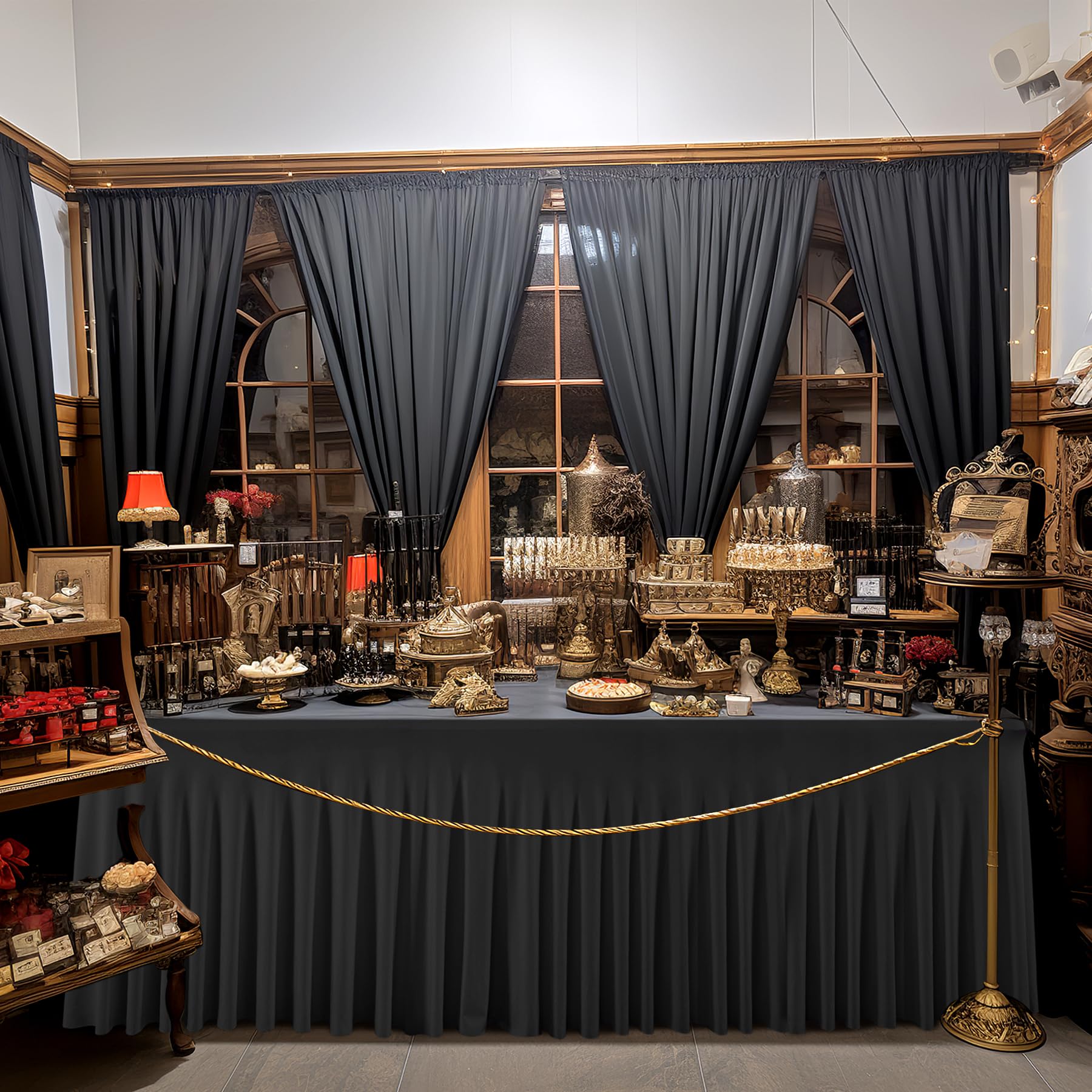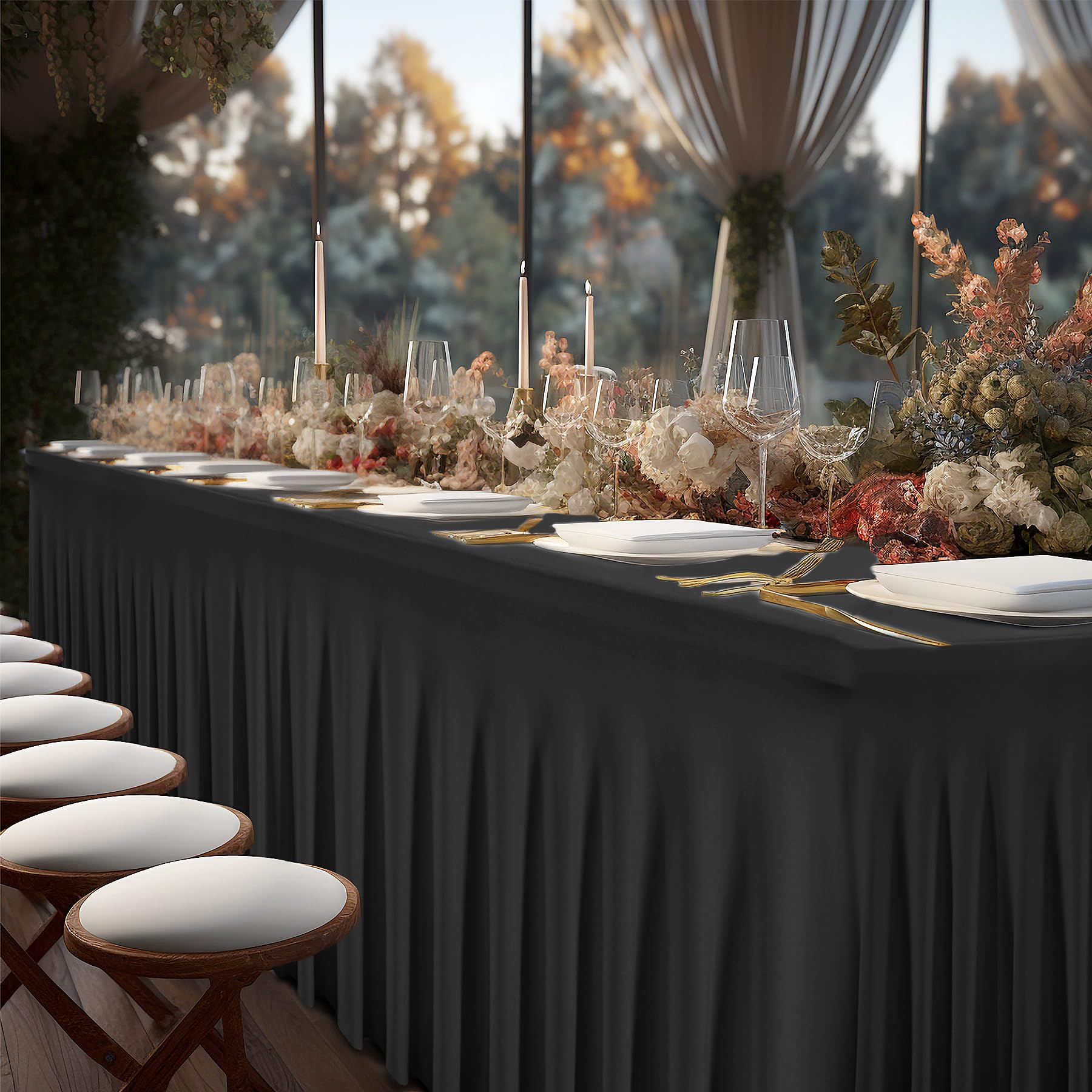 - 【Good Spandex Table Cover】 - Our black table cloth with skirt are made from 90% polyester material and 10% spandex fabric, which is stretchable, durable. The elasticized design ensures a snug fit on the table, preventing any movement or slipping during use. It is also reusable and will look as good as new every time it is used for any occasion or party. Enjoy the convenience of a versatile, elegant and practical tablecloth that adds a touch of sophistication to your event decor.