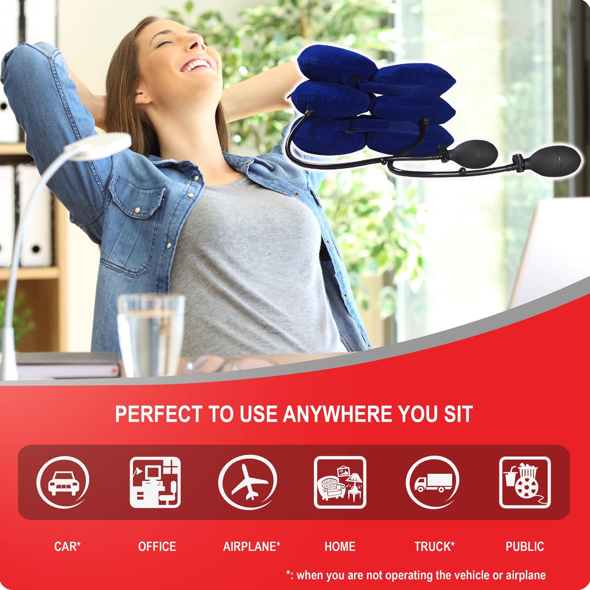 - EASE of USE & MOBILE - Simply puts on your neck, choose the side where the pain is, inflate according to instructions, and enjoy the relief. It can be deflated in seconds and folded with ease, it can be put into your bag or suitcase and will not take up large space.