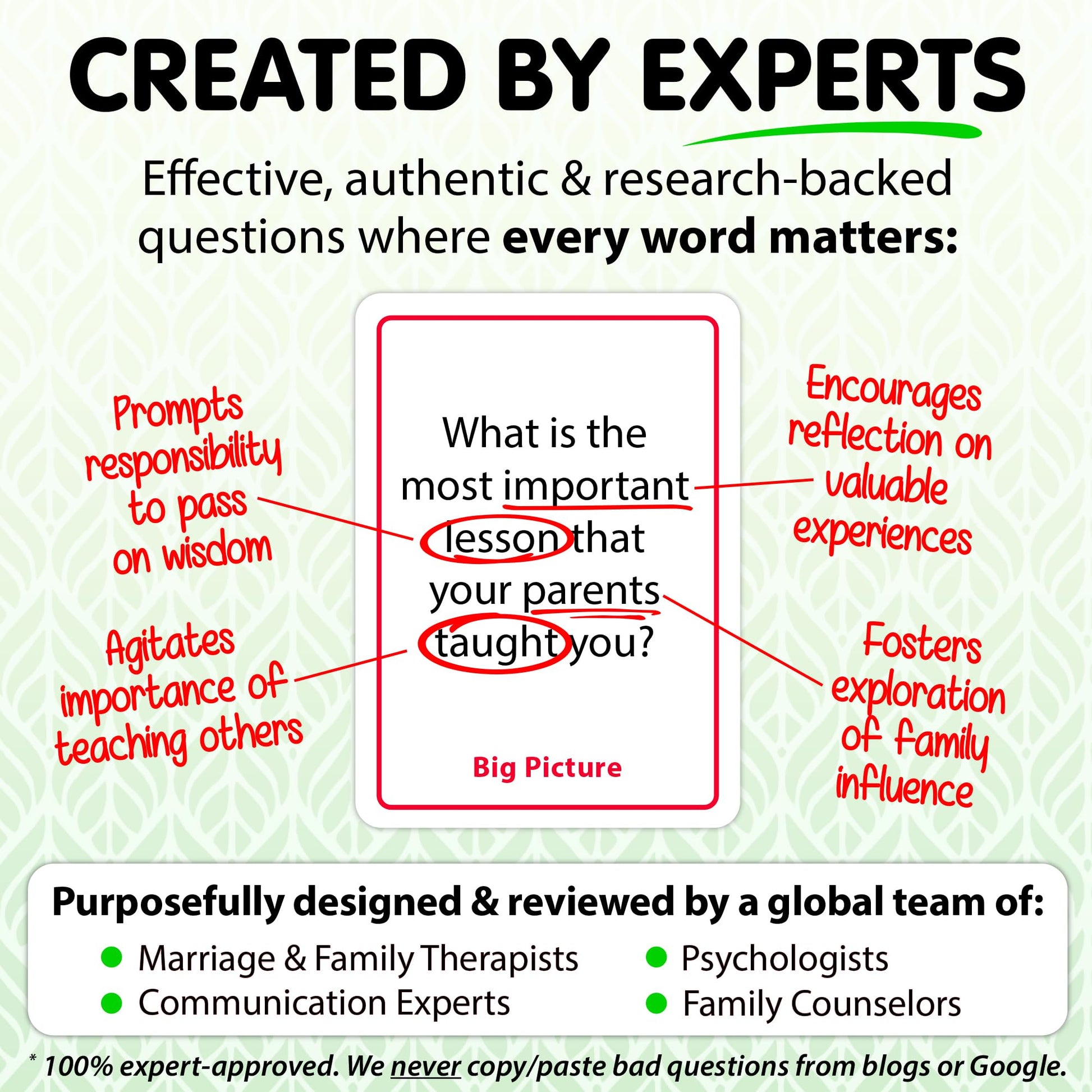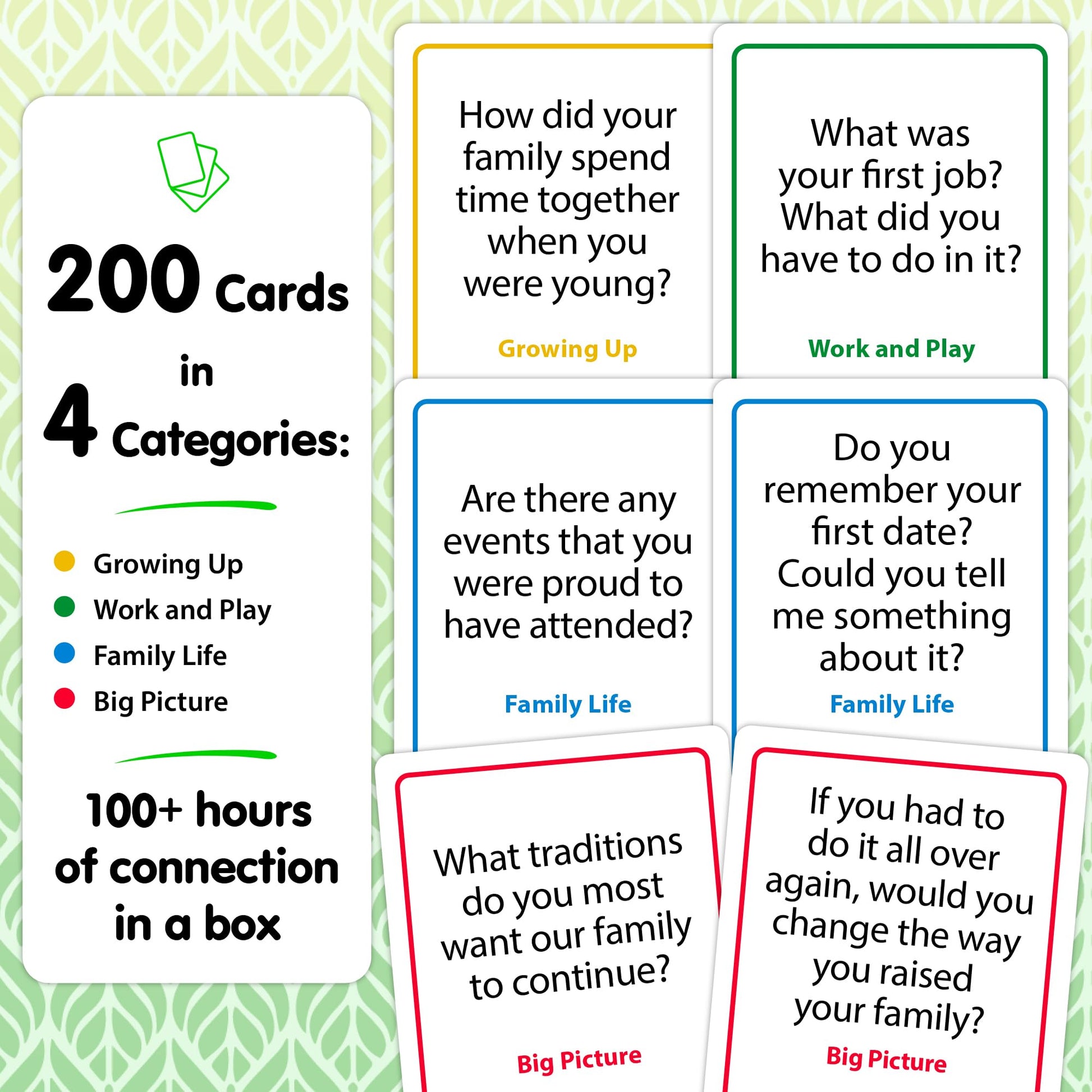 - DON'T LOSE THE MEMORIES - Learn your grandparents and parent’s stories while you can. A lifetime is a long time remember, so our conversational cards provide a simple, guided structure to recalling personal history