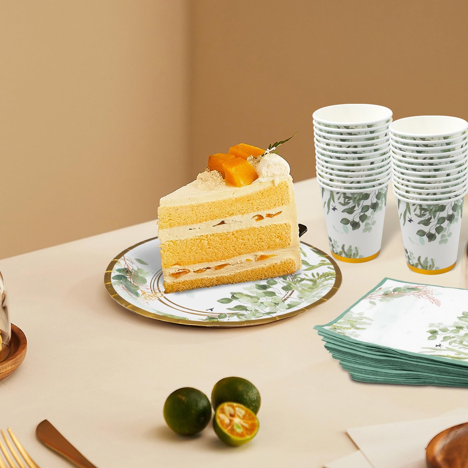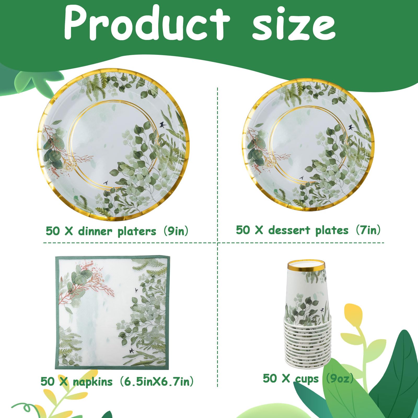 - Greenery Dinnerware Party Set: This sage green disposable plates can serve up to 50 guests, includes 50 pieces 9 inch dinner plates, 50 pieces 7 inch dessert plates, 50 pieces 9 oz paper cups, and 50 napkins to meet your daily dining table decoration needs.