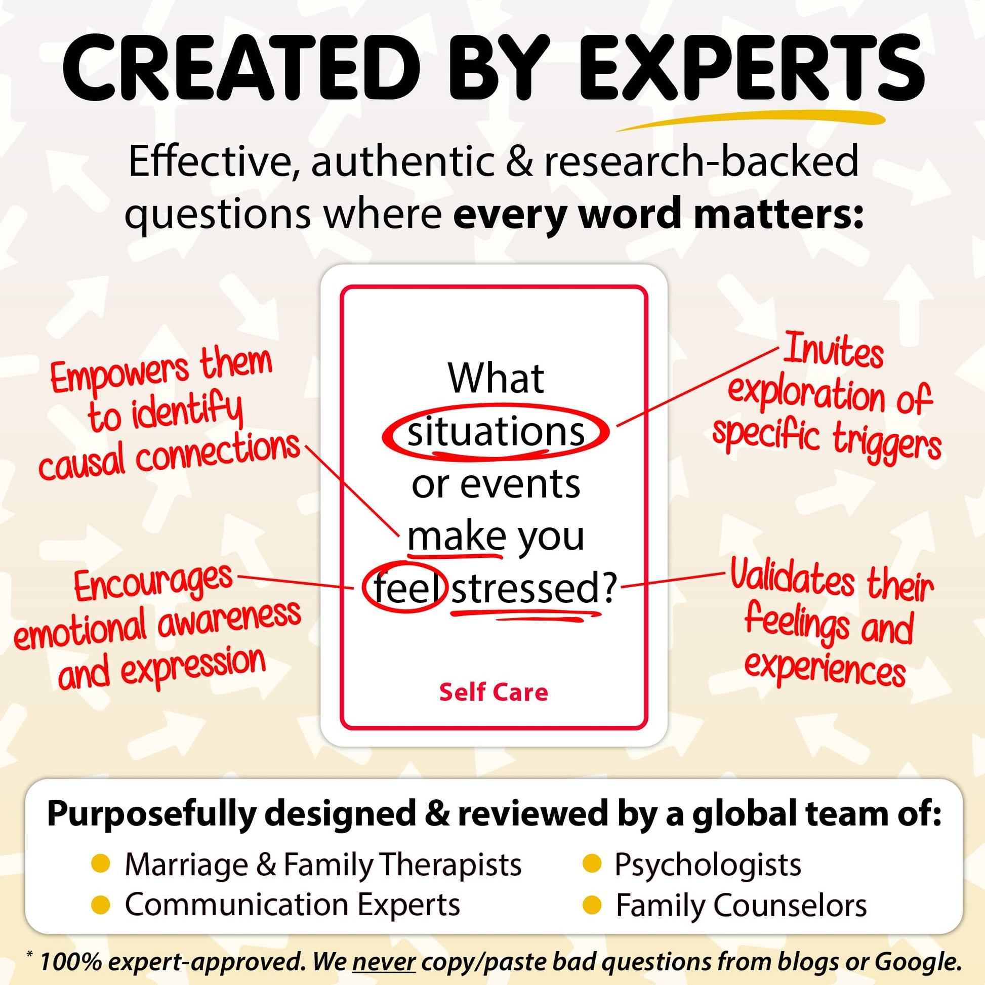 - NO UNCOMFORTABLE QUESTIONS. Dive into fun conversations with confidence! Each prompt is child-friendly, non-confrontational, non-judgmental and non-political. They are suitable for all ages, family structures and confidence levels, and have been expertly crafted to be used in sensitive or traumatic situations.
