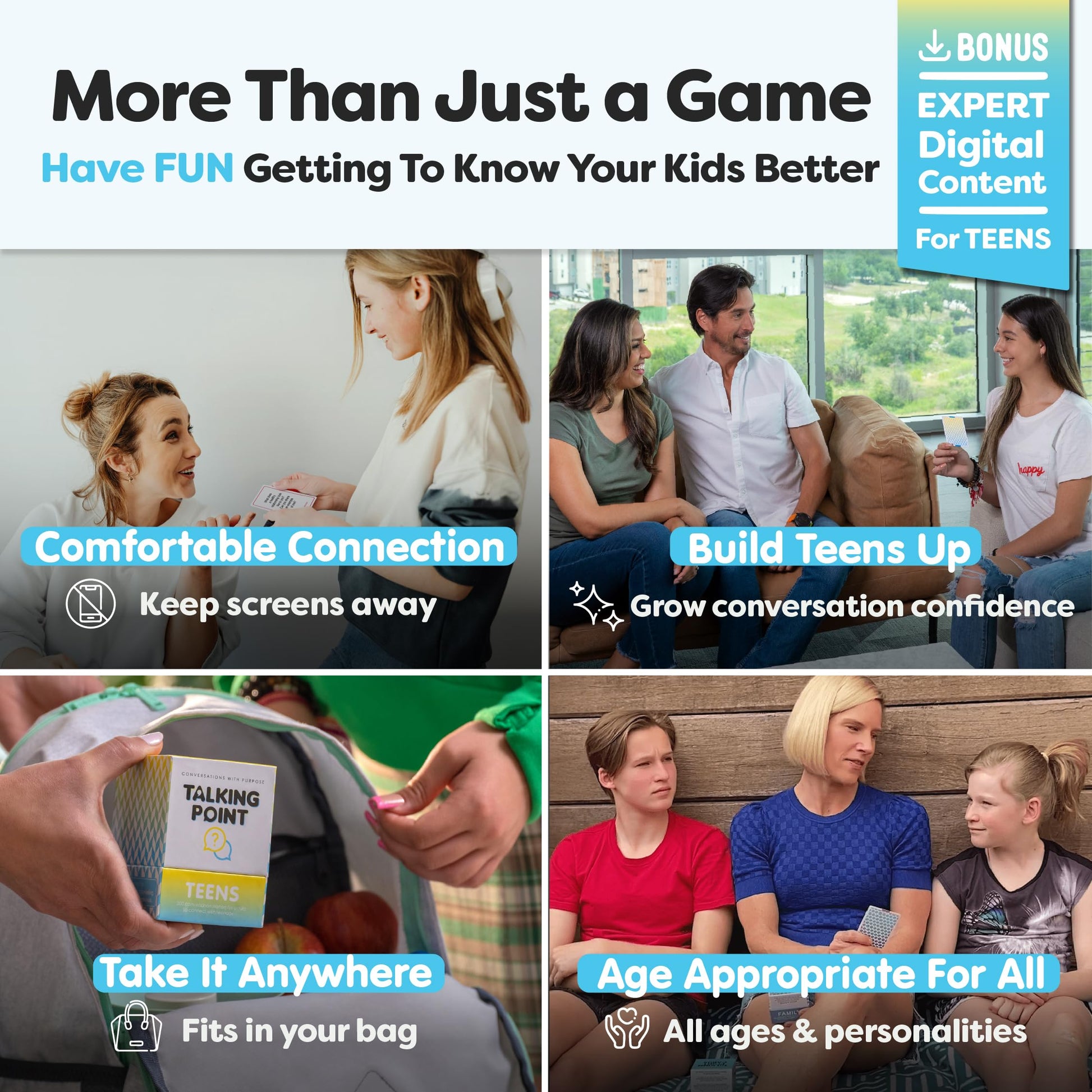 - DO YOU EVER struggle to start a conversation with your Teen? Or keep it going? Parenting teenagers can be tough so the Talking Point Cards Teens Edition helps you ask great questions and transform your parent-child relationship through relationship-building conversation. Our table talk cards deck contains 200 exploratory questions and topics that teens and parents alike will love sharing together