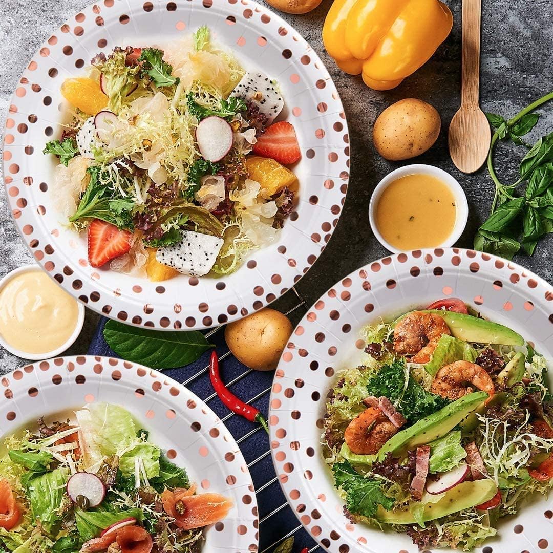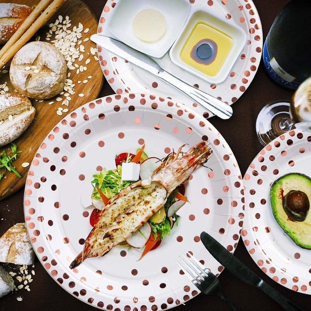 - 【Cute rose golden polka dots 】The whole rose gold dot disposable party supplies sets full of rose golden polka dots, very fashion and pretty design. The color is nice and attractive, every guest will love the pretty design.