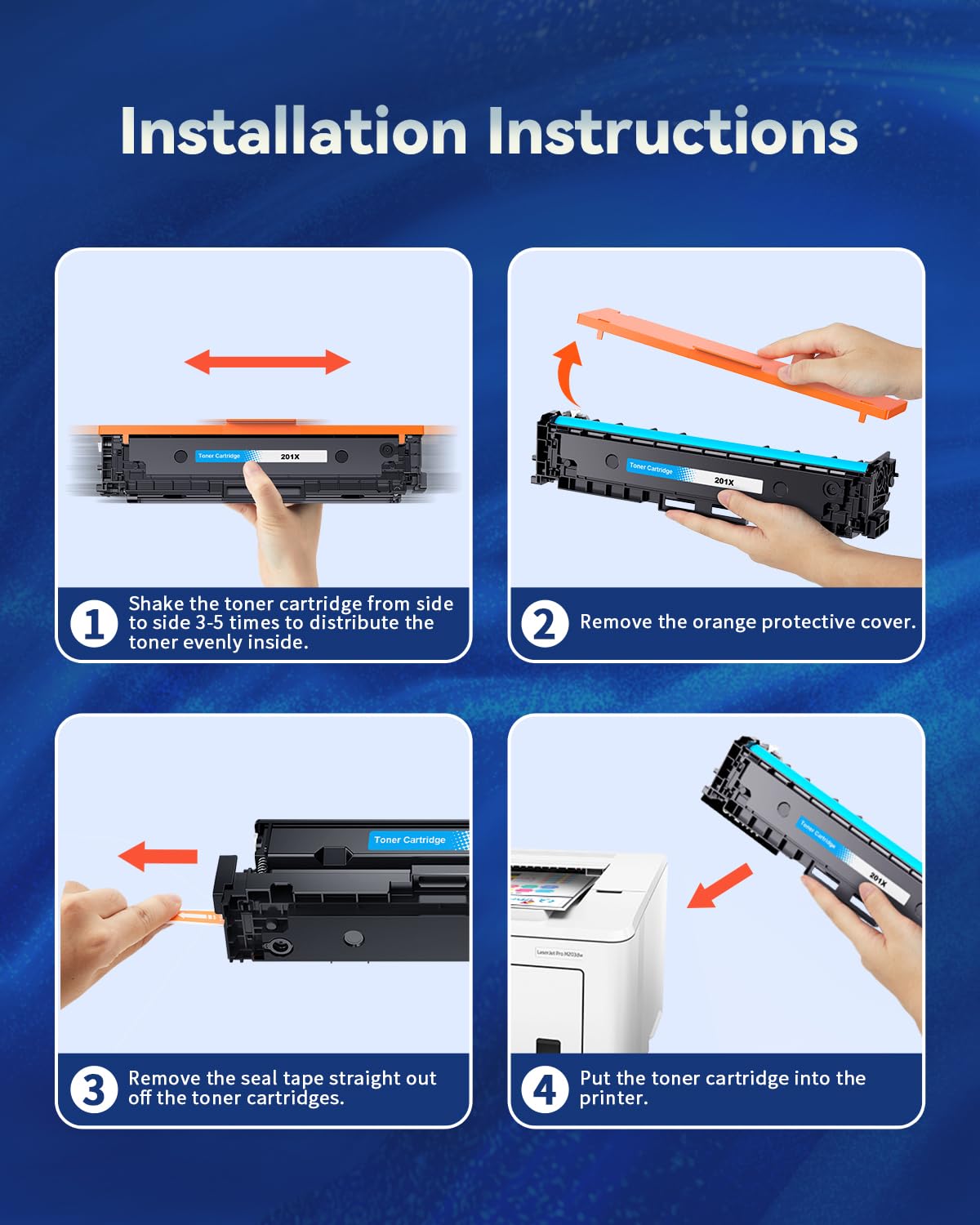 - Package contents: total 4 pack of compatible hp 201x toner cartridges 4 pack high yield (201X CF400X Black toner, 201X CF401X Cyan, 201X CF403X Magenta, 201X CF402X Yellow)