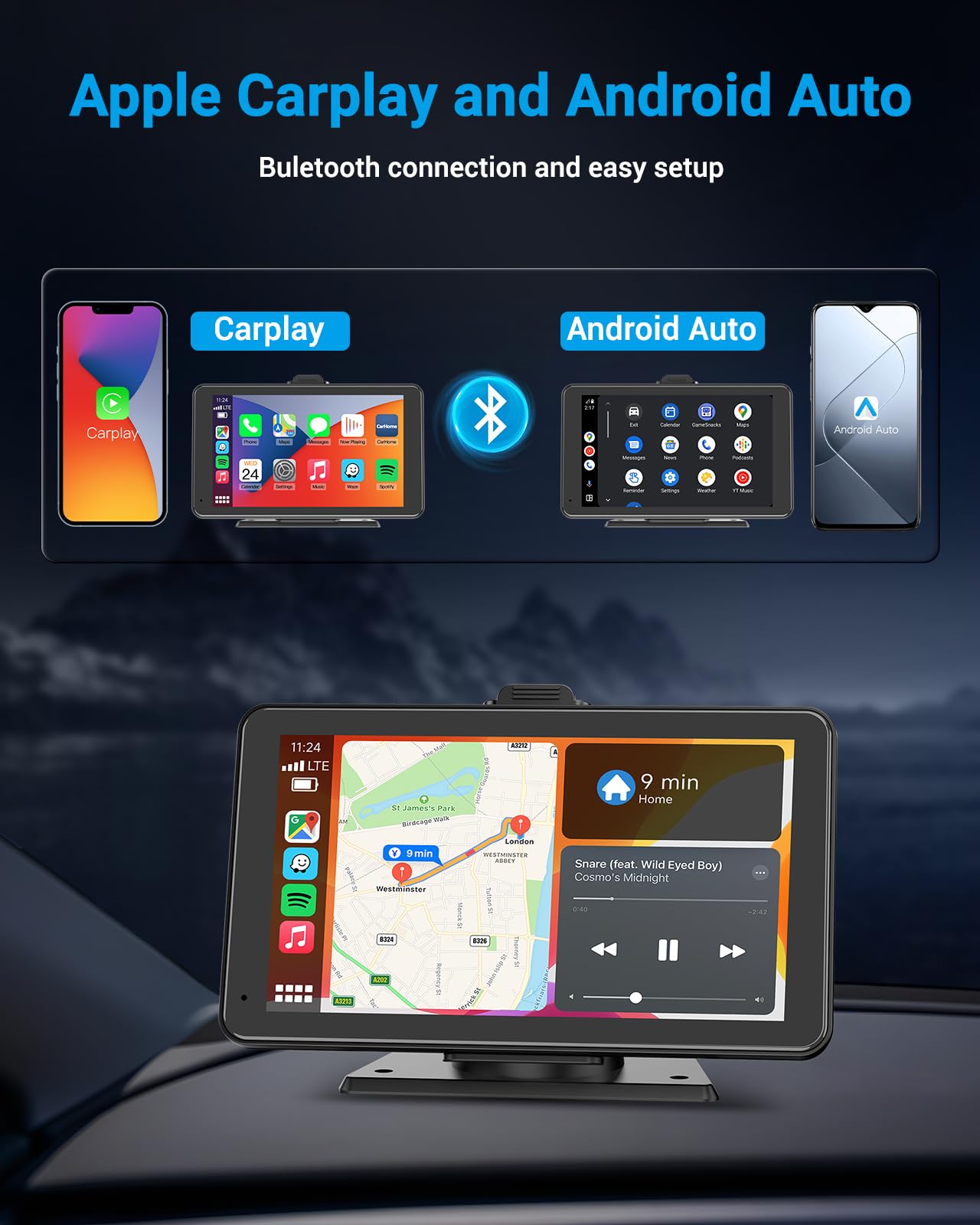 - 【Wireless Carplay & Android Auto Screen】This portable car stereo supports wireless carplay and android auto, simply connect with your smartphone via Bluetooth and bring the features and apps to the portable car device so you can access map navigation, music and app usage. Allowing you to use your cell phone functions more safely and conveniently while driving on a large, intuitive display.
