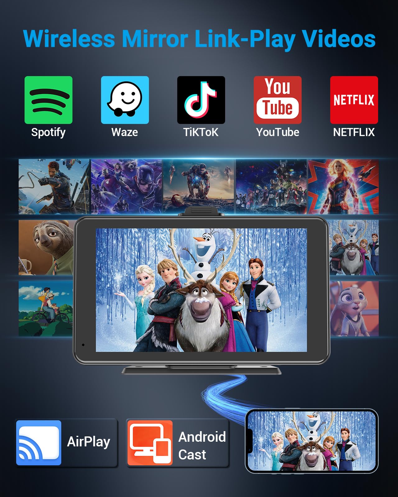 - 【AirPlay & Android Mirror Link Function】This car play screen is compatible with AirPlay and Android mirror link function, sync your smartphone to the large 7-inch HD IPS screen and enjoy more features like Netflix movies, YouTube videos, Maps, and more, and you can mirror movies for kids to watch on long trips.