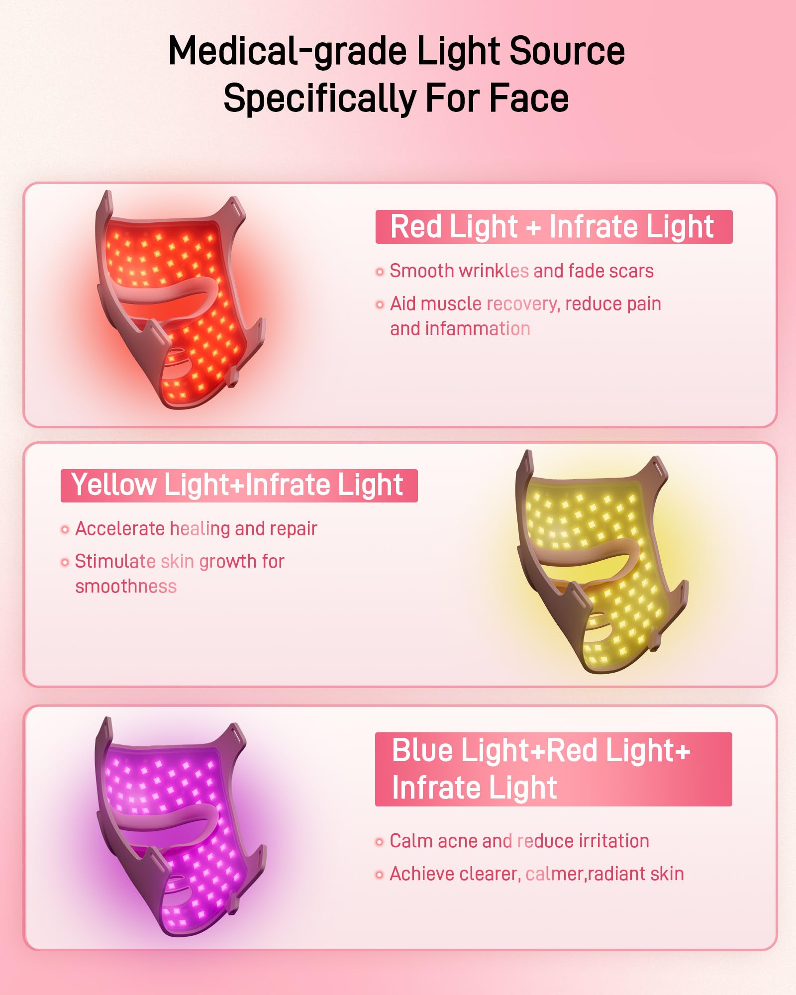 Details: The LED Light Therapy Mask (Model:MK66R-B) is an over-the-counter device that is intended for the use in the treatment of full-face wrinkles.