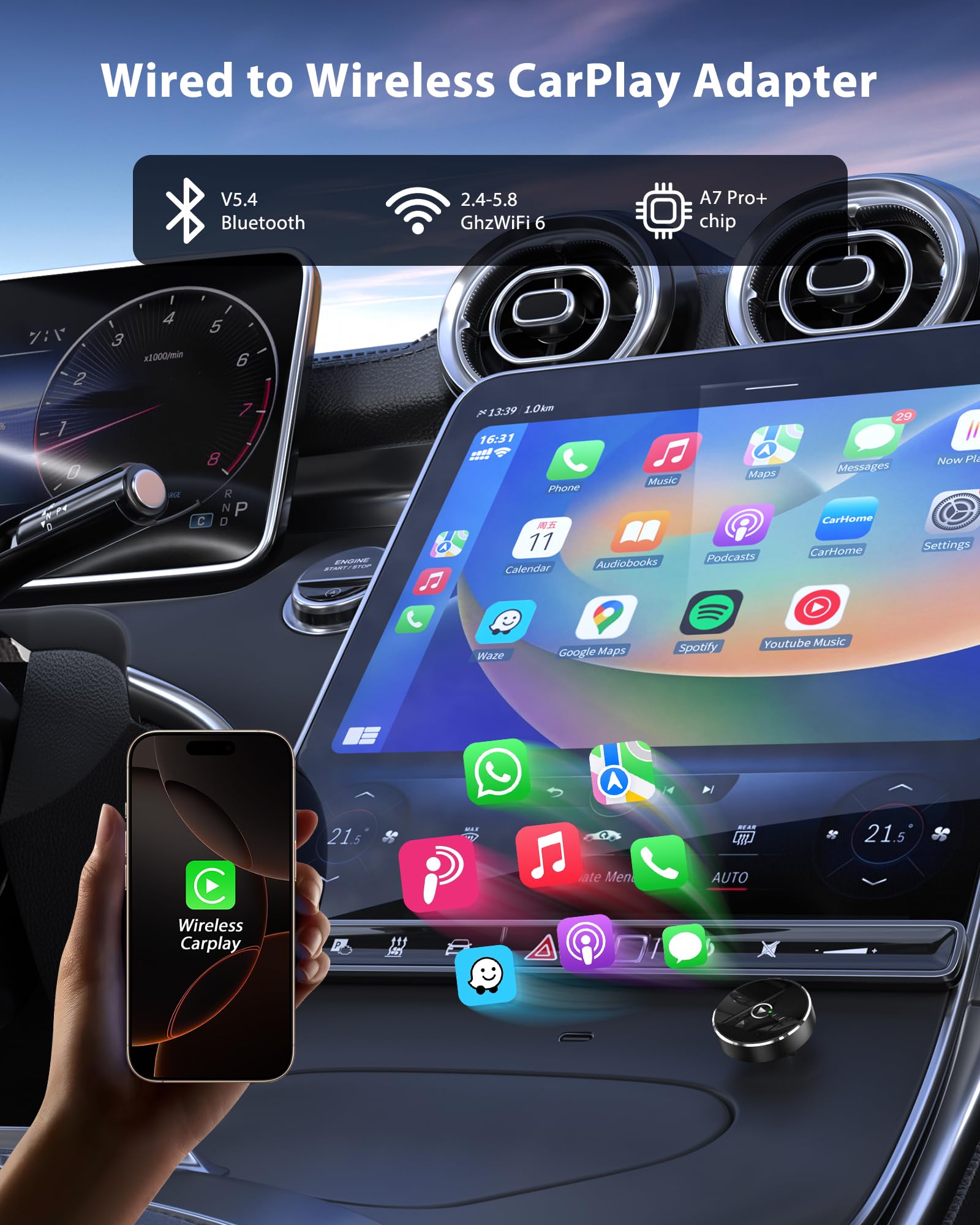 - Smaller but Faster & More Stable: Our wireless apple carplay adapter equipped with a 50% reduction in size, Build in the latest 5.8 GHz WiFi, Bluetooth 5.3, and a next-gen A7 Pro+ chip. Get fast access to your favorite CarPlay features such as navigation, music, messages, phone calls, Siri assistant, etc