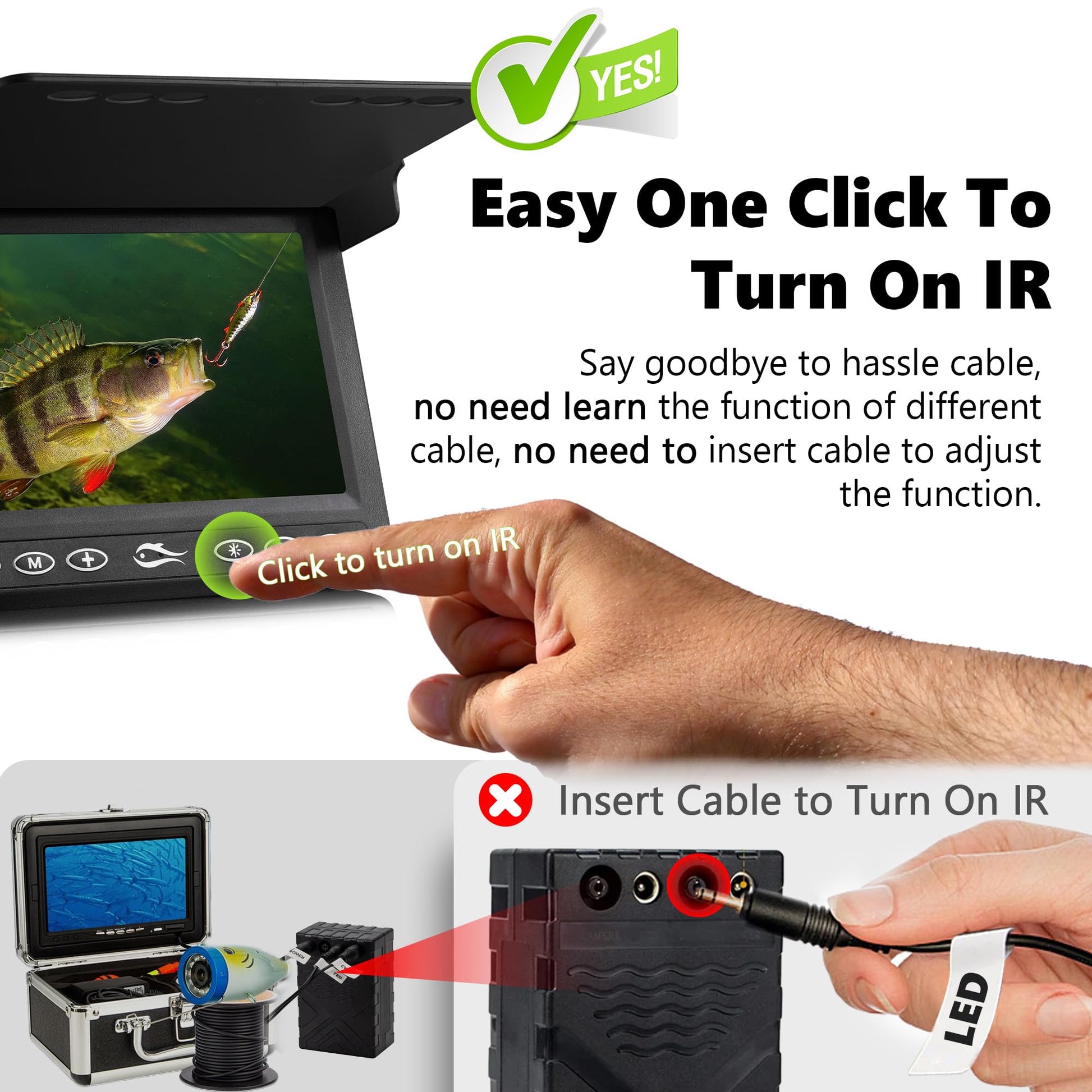 • [Versatile 3-Grade IR for Dark: Fish Deeper, Fish More] --- Adapt to any underwater conditions with our 3-mode IR lighting system. Unlike other cameras that require plugging and unplugging cords, with this, adjust the lighting easily with the simple "IR" button—no complicated cables needed. The IR light, invisible to fish, illuminates dark waters without spooking them. And the built-in sun visor ensures clear viewing even in bright sun or snow, enhancing your overall fishing experience.