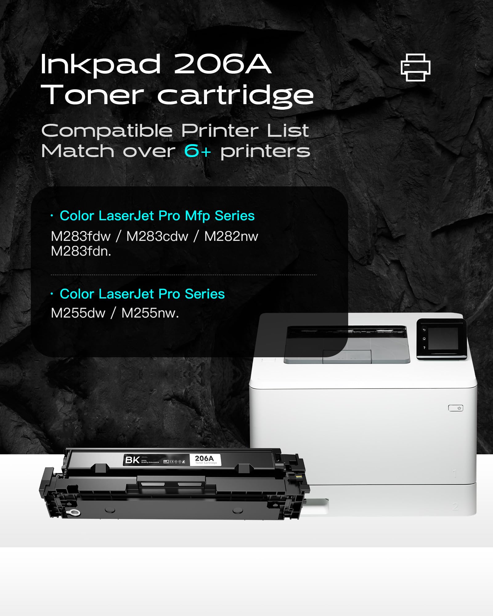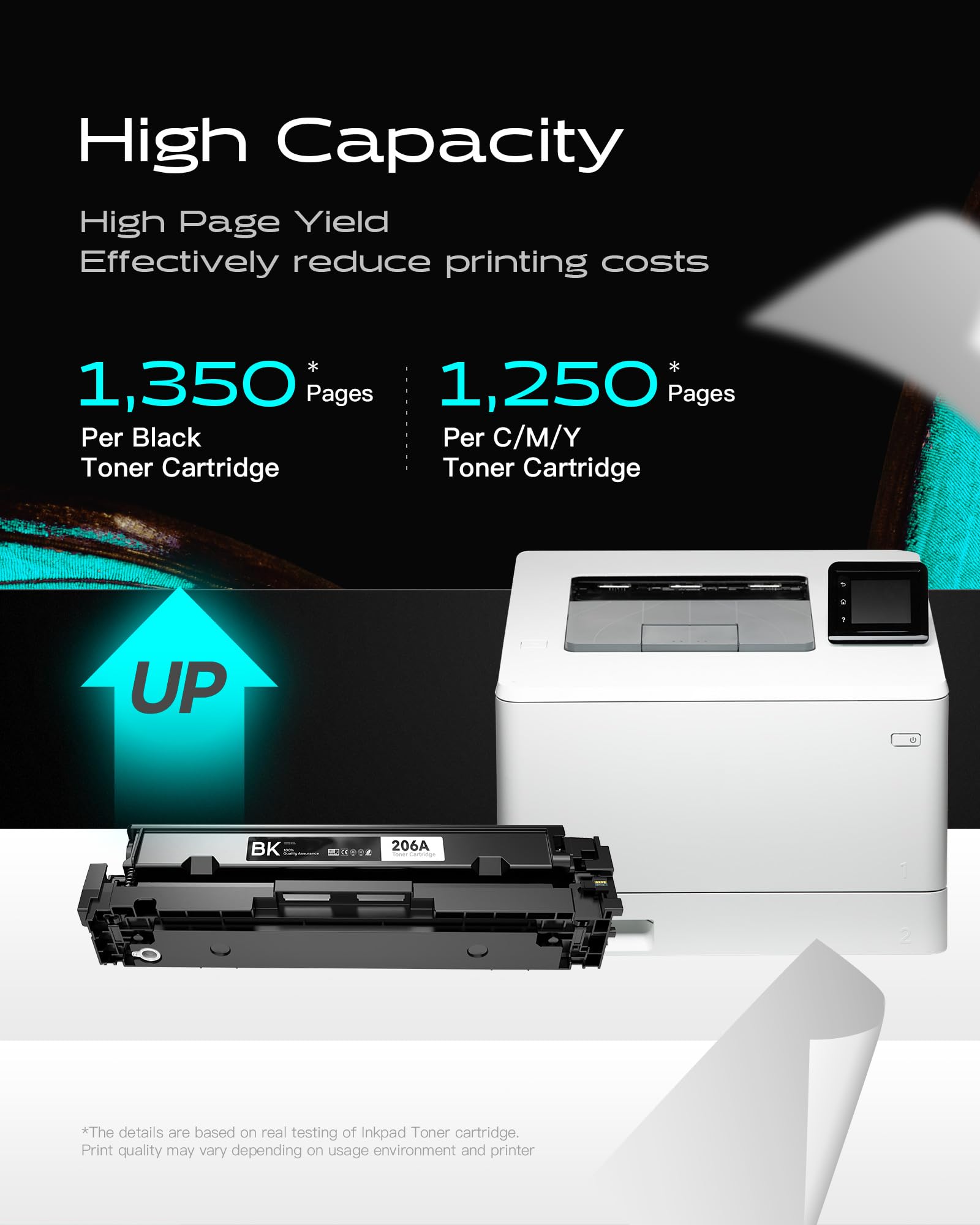 - High Yield Printing: Say goodbye to frequent toner cartridge replacements with iNKPAD 206A (W2110A) 206 A Toner Cartridges, capable of delivering an astounding page yield of up to 1,350 pages per black W2110A and 1,250 pages for per 206A color W2111A W2112A W2113A toner(@ 5% page coverage). Experience longer printing sessions and maximize your productivity effortlessly