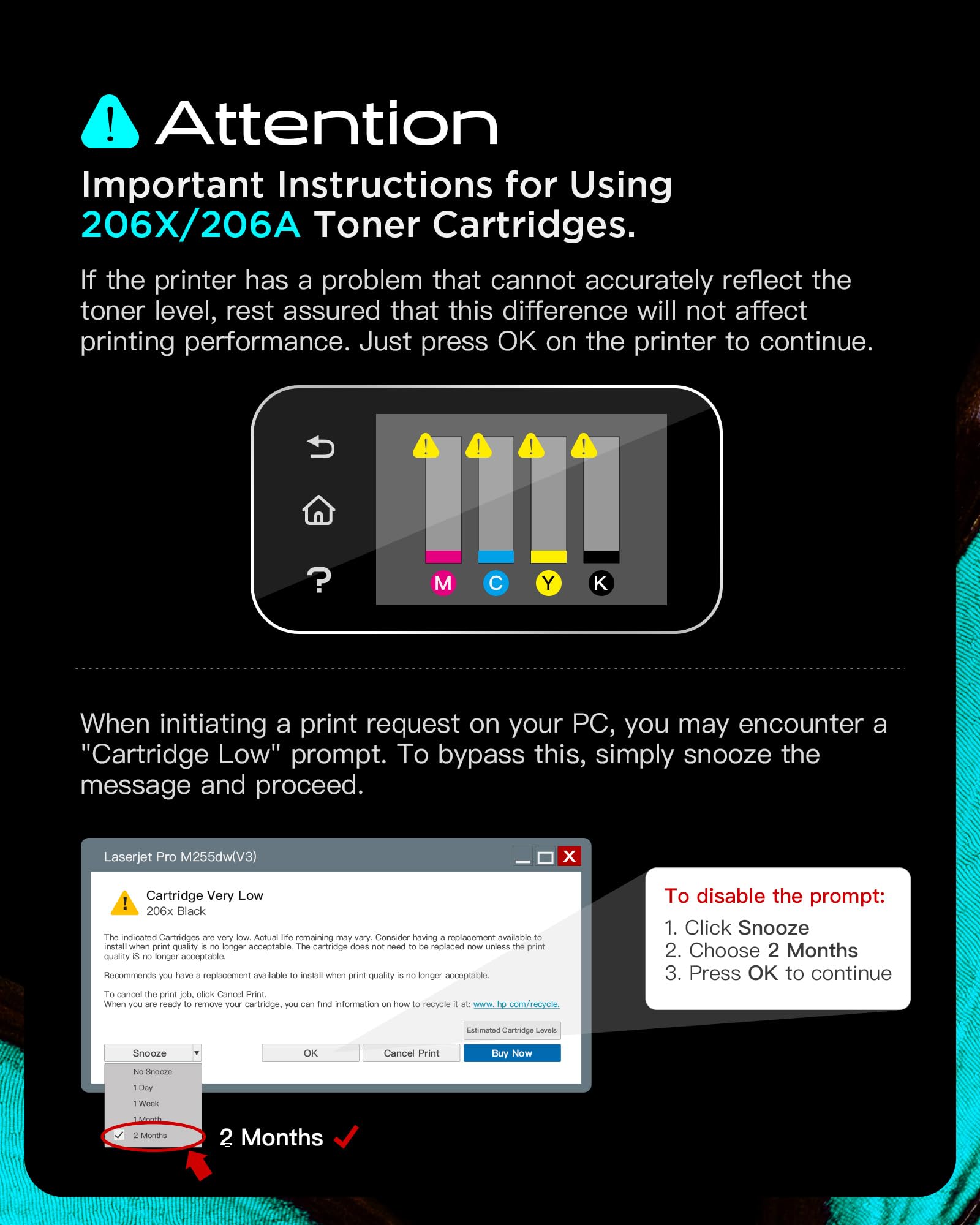 - Large-Capacity Toner Cartridge: With its large-capacity design, this Non-OEM 206A W2110A W2111A W2112A W2113A 206 A 206X Toner Cartridges ensures extended periods of uninterrupted printing. No matter how demanding your printing requirements, this drum can handle it with ease, resulting in enhanced productivity and reduced downtime