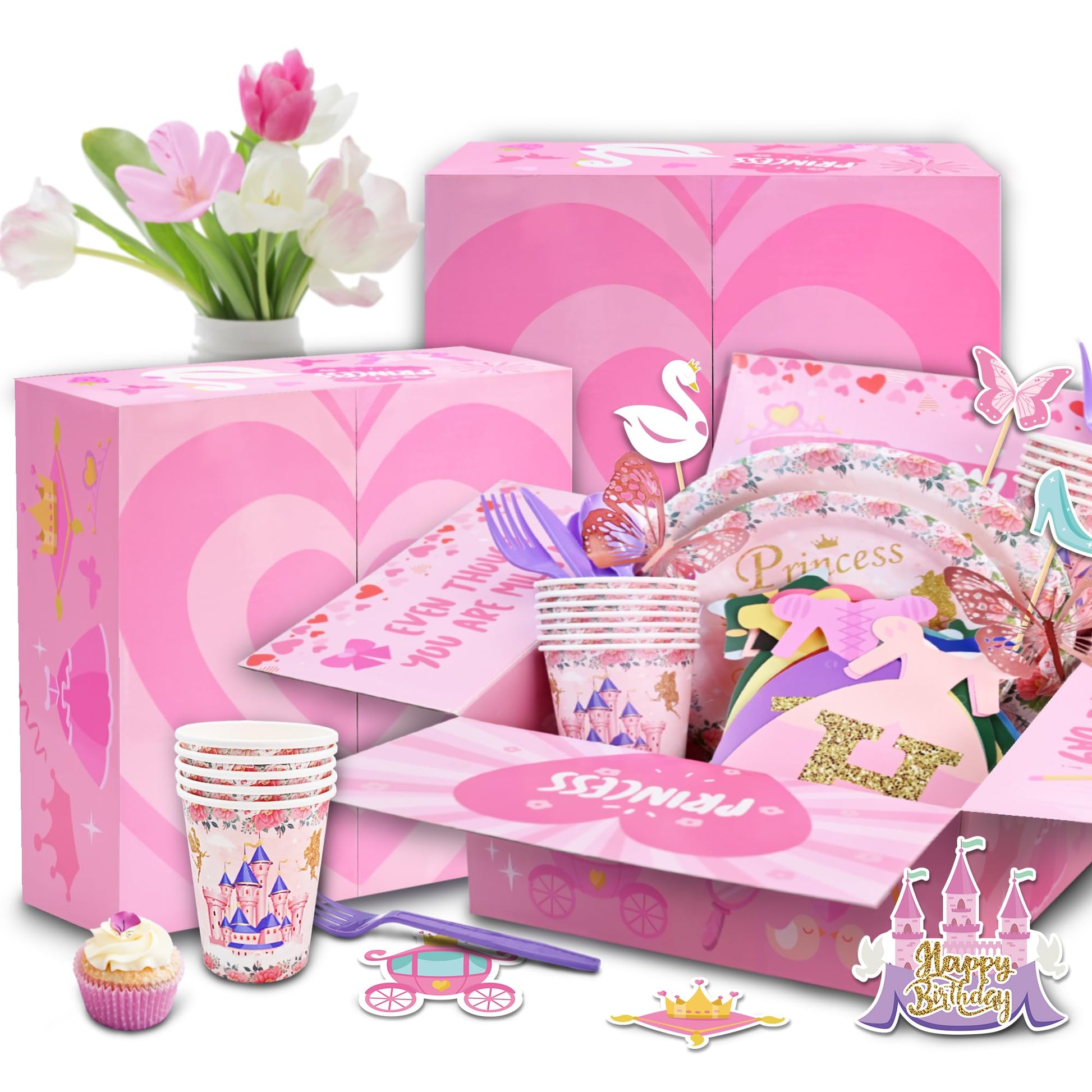 - šćRoyal Unboxing ExperiencećDiscover our princess party kit in beautifully designed pink packaging adorned with regal patterns. The enchanting exterior hints at the magical decorations inside, making unboxing the first delightful moment of your celebration