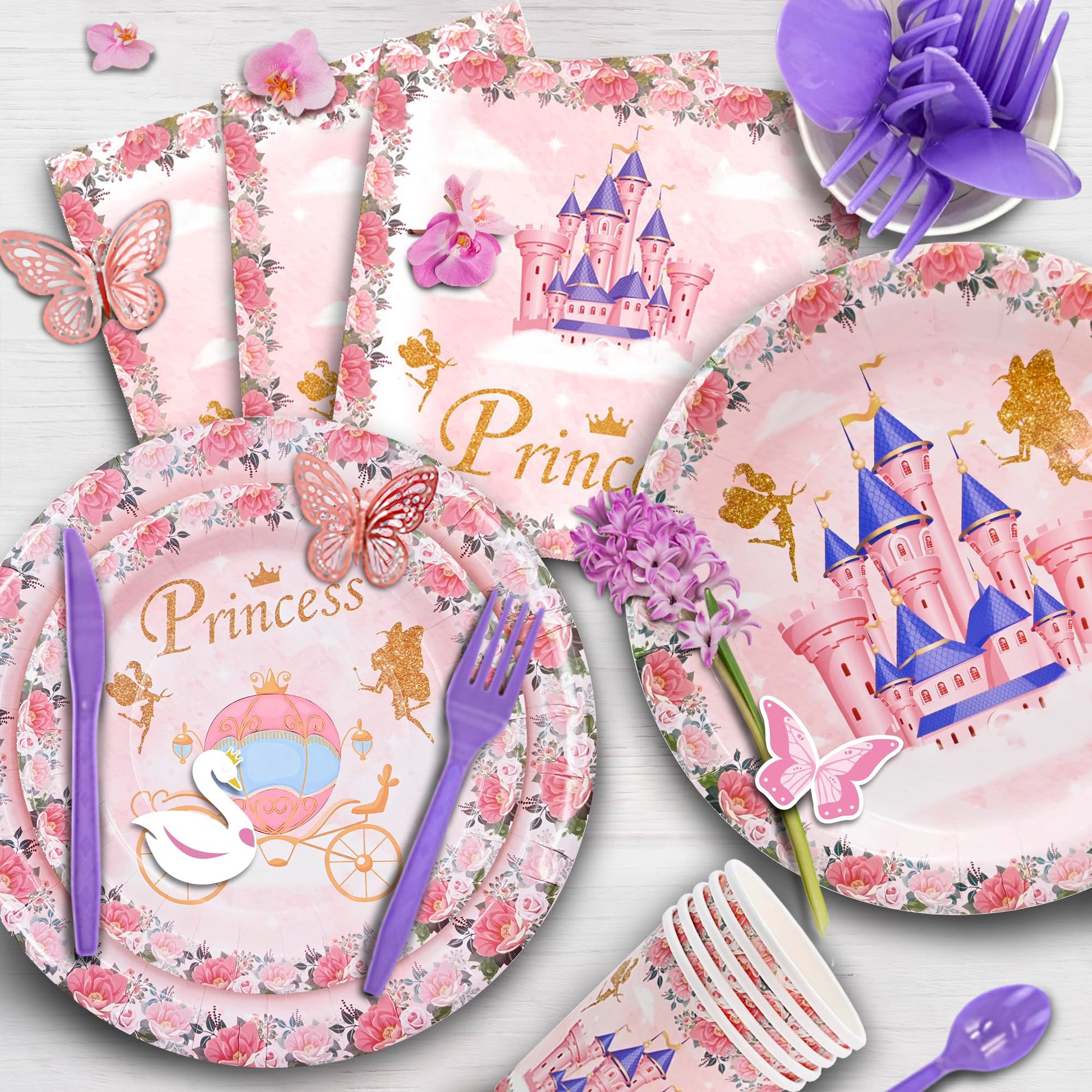 - šćRoyal 12 Tableware Set CollectionćComplete your princess banquet with 12 elegant place settings, including 9" & 7" plates, 9oz cups, 36 utensils, and matching napkins. These beautifully coordinated paper goods blend practicality with royal charm, perfectly complementing your castle decor and balloon displays for a truly majestic dining experience