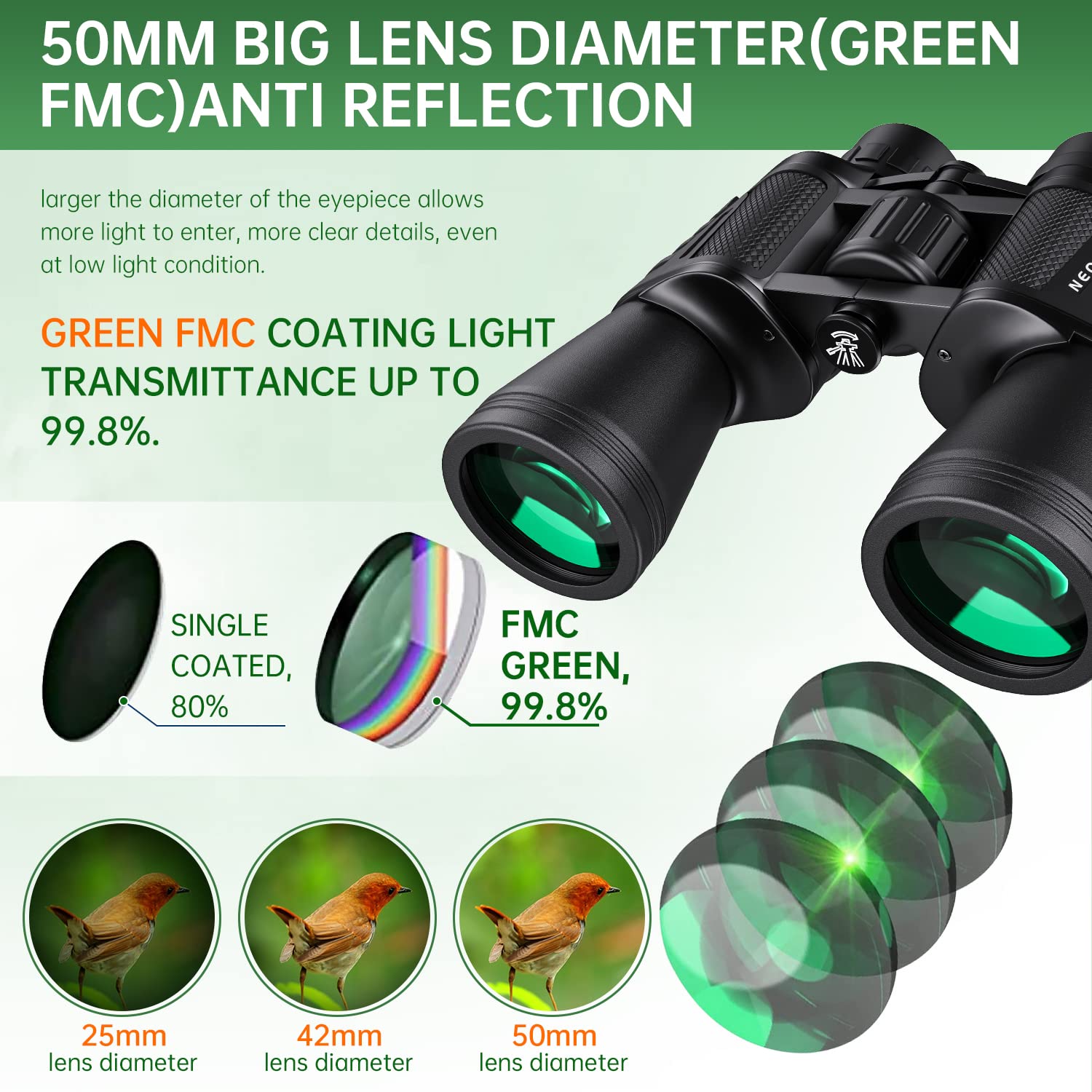 - ULTRA CLEAR IMAGE - Multilayer-coated aspherical lens elements provide superior light transmission and minimal distortion, better image brightness, contrast, and quality. BAK4 Porro Prism has a higher refractive index. It provides 99.8% light transmission and improves color reproduction. Green FMC anti-reflective coating reduces the reflected light in the objective lens. It enhances light transmission, image brightness, and image sharpness. It will give you an extraordinary using experience.