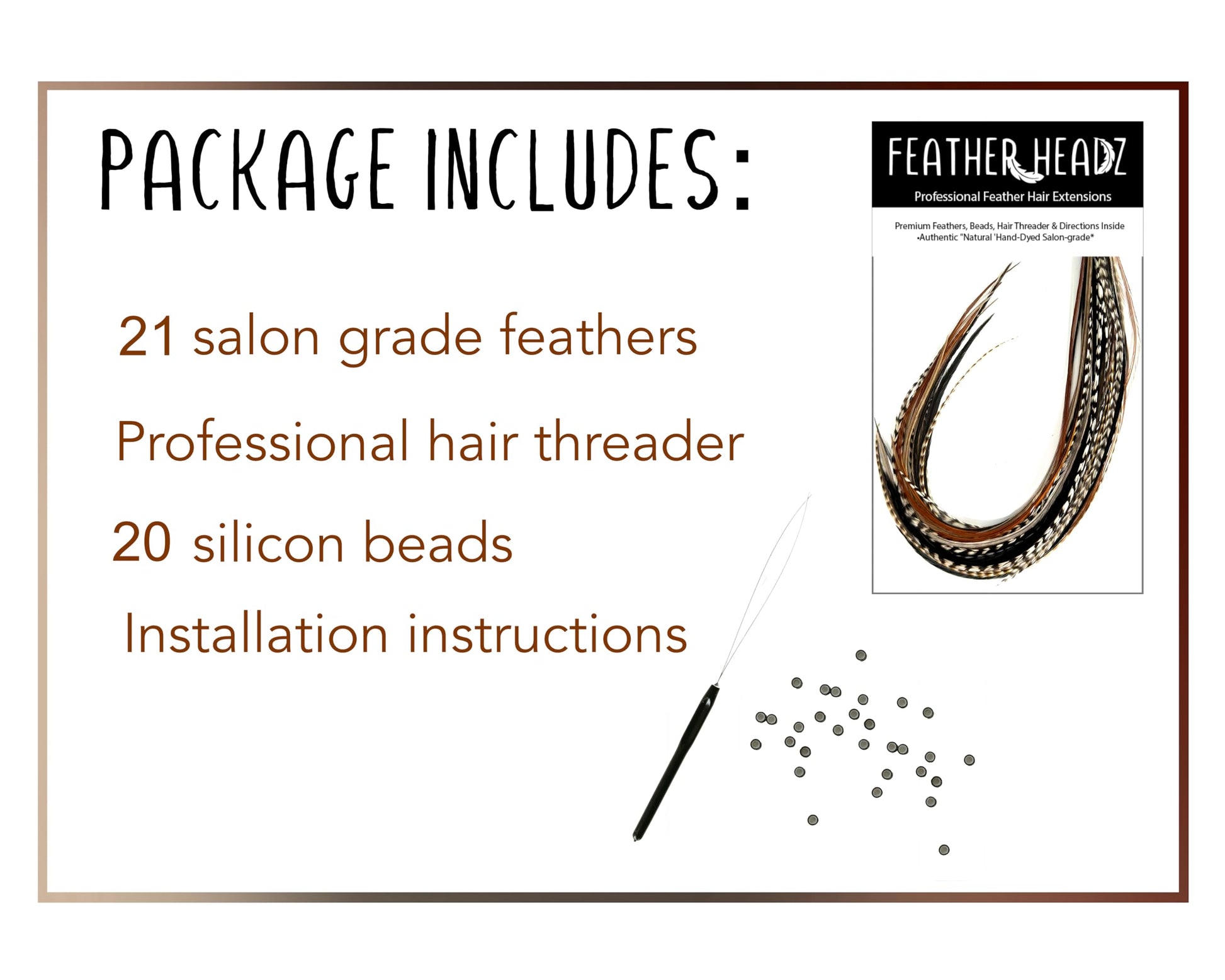 Details: These feathers can be washed, styled, air dried, curled and even flat-ironed with your hair (withstanding heat up to 400°). Real authentic genuine rooster feathers. This package will include 21 Natural Color individual feathers, 20 micro link beads for attaching, Hair threader and installation instructions.Salon Quality Feathers: 100% Real Rooster Feathers between 9” - 14” long. Feather hair extensions offer a unique way to add some spice to your look. Curl them, wear them up or straighten them out. You can treat your feathers in any way that you do with your natural hair, even wear them for just one night out. Tons of Styling Options: These feathers are 100% real authentic rooster feathers. All feathers vary in shape, size, slight color variations making each package unique. Our feather hair extensions are long and thin. Feather hair extensions are crimped into the hair with a micro link extension bead and can be removed anytime with no damage to your hair. Soft & Comfortable Material: Feathers can be washed & curled. Includes hair threader & 20 micro link extension beads in kit. 21 Individual feathers for hair extensions. Feathers attach like hair extensions but are non-damaging & can easily add color to your hairstyle. If you would like to shorten them, cut from the top, not the ends, to make them look natural & not to alter the shape of the ends of the feathers. Features:21 feathers 20 micro link hair extension beads for attaching Hair threader Installation instructions For wavy, curly, or straight hair Withstanding heat up to 400°