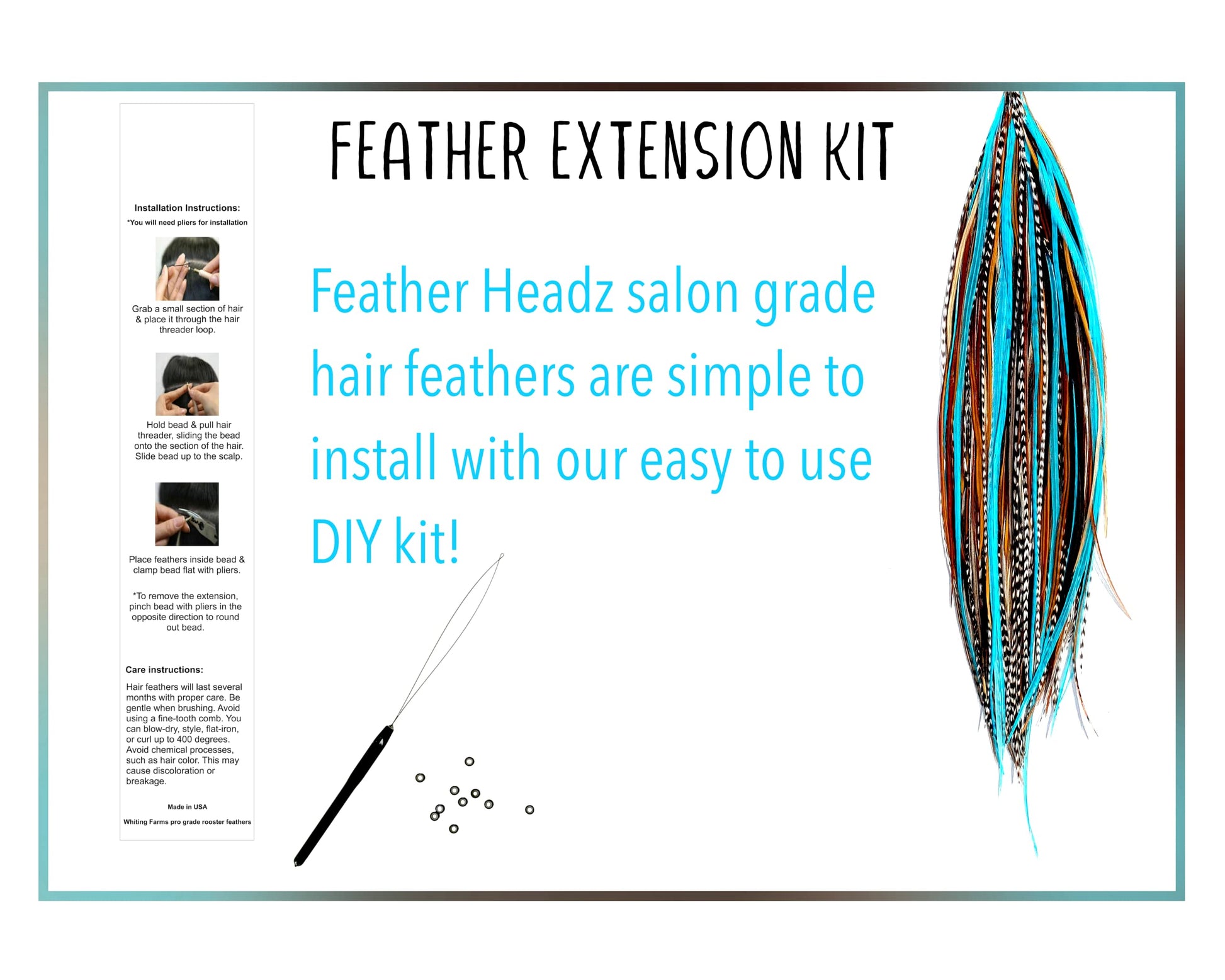 Details: These feathers can be washed, styled, air dried, curled & even flat-ironed with your hair (withstanding heat up to 400°). Real authentic genuine rooster feathers. This package will include 21 Natural & Turquoise color individual feathers, 20 micro link beads for attaching, Hair threader and installation instructions.Salon Quality Feathers:100% Real Rooster Feathers between 9” - 14” long. Feather hair extensions offer a unique way to add some spice to your look. Curl them, wear them up or straighten them out. You can treat your feathers in any way that you do with your hair, even wear them for just one night out.Tons of Styling Options:These feathers are 100% real authentic rooster feathers. All feathers vary in shape, size, slight color variations making each package unique. Our feather hair extensions are long and thin. Feather hair extensions are crimped into the hair with a micro link extension bead and can be removed anytime with no damage to your hair. Soft & Comfortable Material:Feathers can be washed & curled. Includes hair threader & 20 micro link extension beads in kit. 21 Individual feathers for hair extensions. Feathers attach like hair extensions but are non-damaging & can easily add color to your hairstyle. If you would like to shorten them, cut from the top, not the ends, to make them look real & not to alter the shape of the ends of the feathers. Features: 21 feathers20 micro link hair extension beads for attachingHair threaderInstallation instructions For wavy, curly, or straight hair Withstanding heat up to 400°.