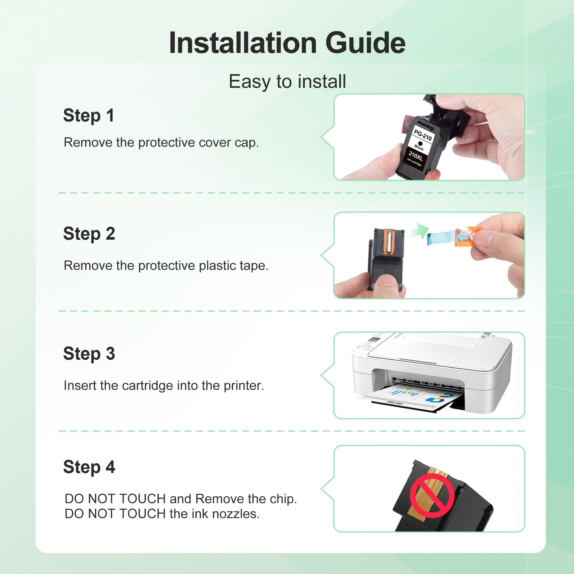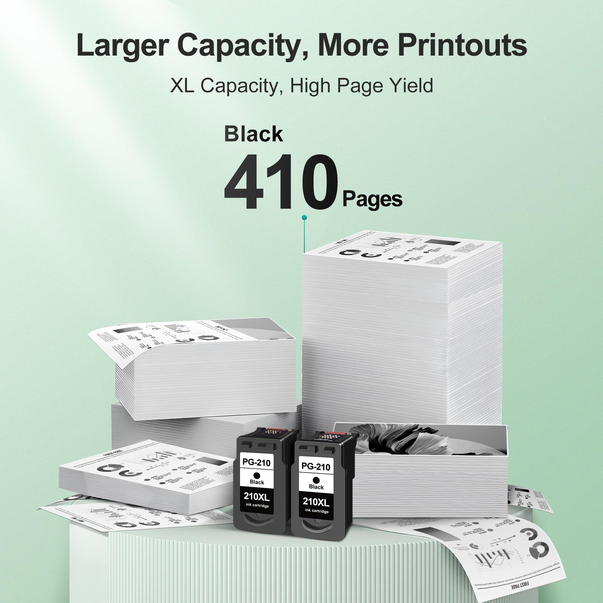 Details: Package includes: 2 black ink cartridge replacement for Canon 210XL PG-210XL Compatible printers: Canon PIXMA IP2702, IP2700, MX320, MX340, MX330, MX350, MX410, MX360, MX420, MP230, MP240, MP250, MP270, MP260, MP480, MP280, MP490, MP495, MP499 Page Yield: Up to 400 page for each black ink cartridge, at 5% coverage by standard A4 paper Strong Stability: With the excellent print stability, 210XL black ink cartridge ensure the smooth and high-efficient printing, delivering crisp and sharp texts to provide you with professional documents every time. Easy to install: Black ink 210XL with the latest smart chips are highly compatible with your printer, ensure the instant recognition. Easy installation steps allow you enjoy the convenience of printing.