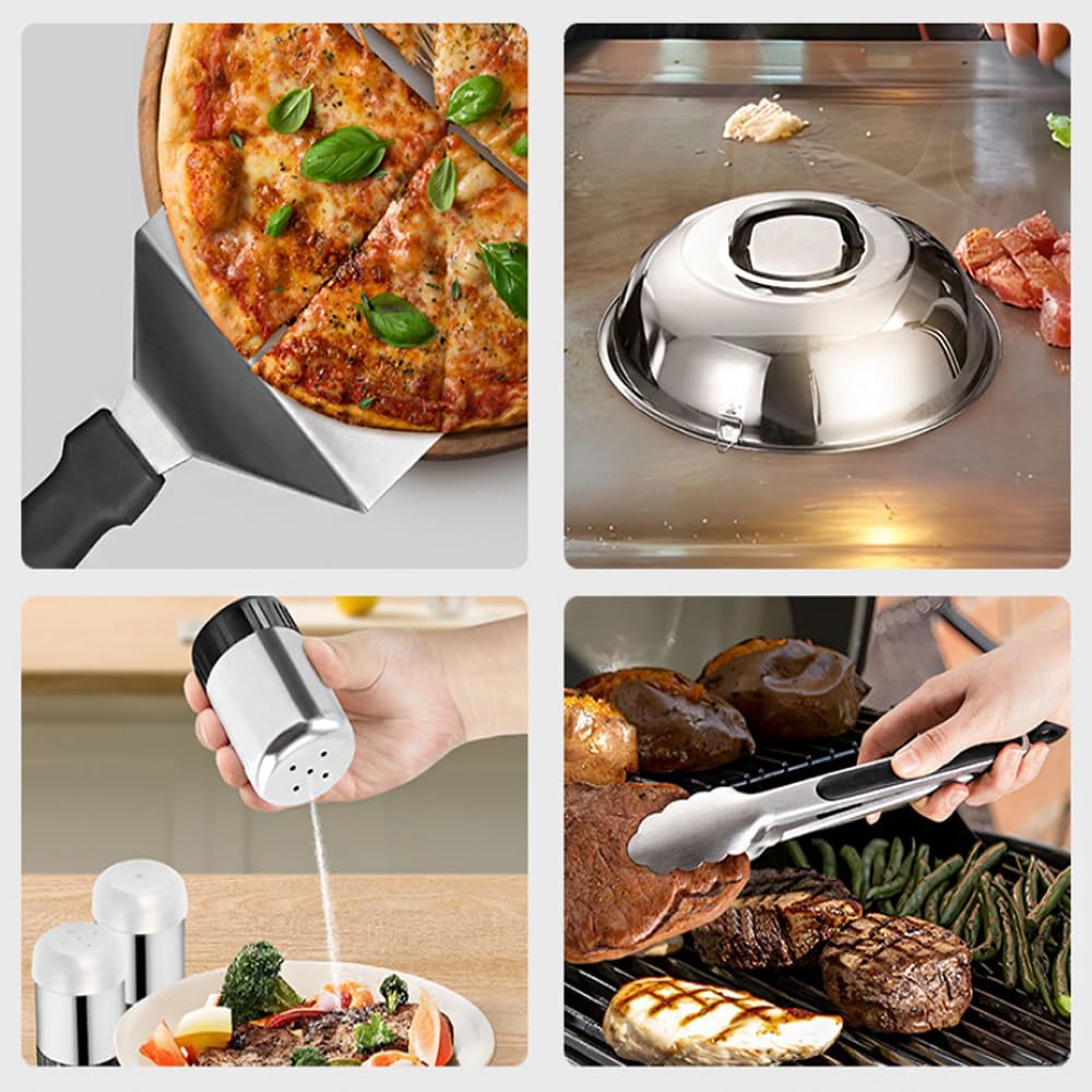 - 【PERFECT GIFT SET】 Griddle accessories kit is a great gift for men or anyone who likes to grill. The park, camping, backyard are the best places for barbecue and grilling. Perfect size for picnics and easy to store in the trunk or kitchen. This professional griddle tools will meet most cooking needs, ideal for Outdoor BBQ, Teppanyaki.