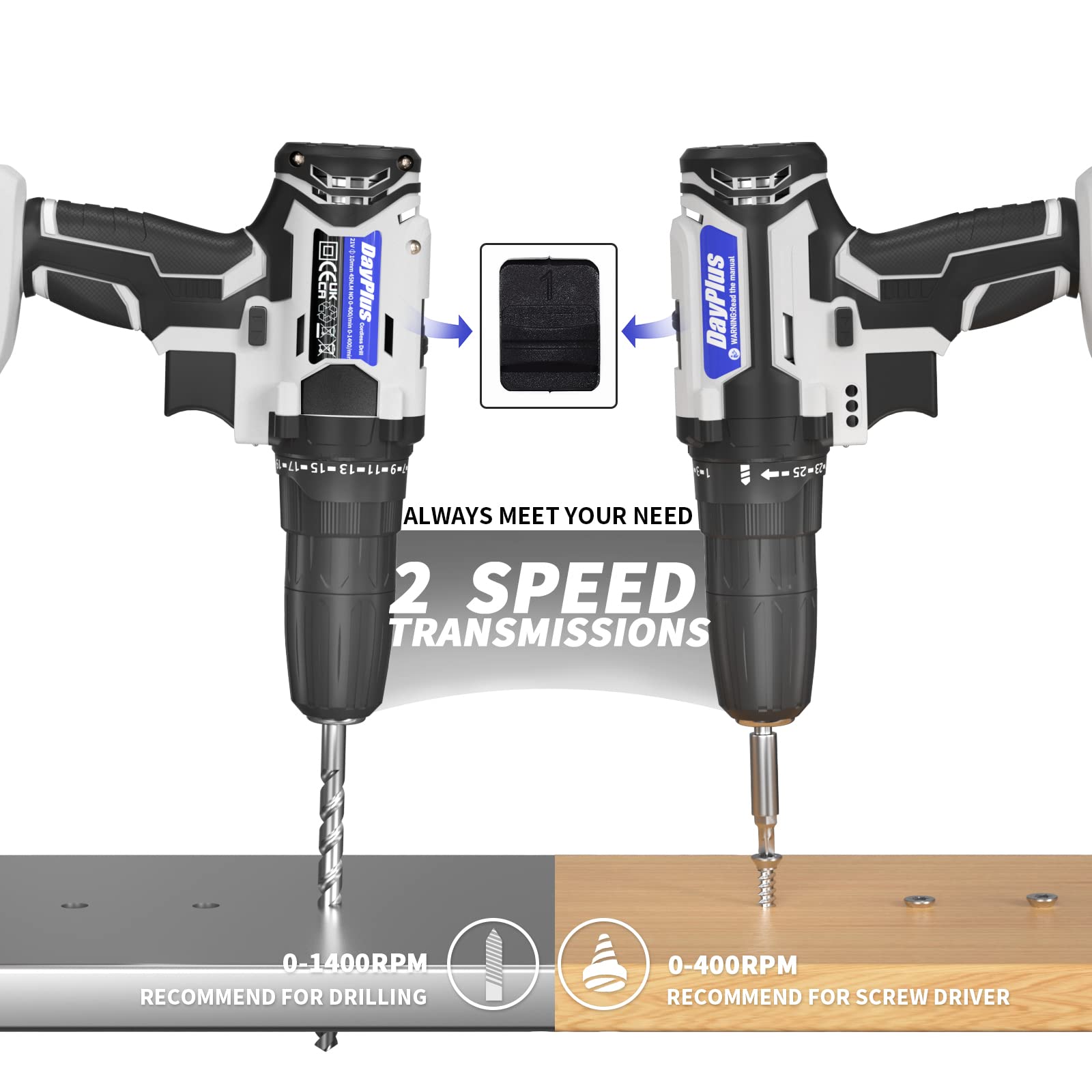 - 【25+1 Position Clutch & 2-Speed Settings】 The power drill can Choose from 1 of 25+1 torque options on the clutch, provides precise control for driving in/out screws to prevent stripping. 2-speed design (0-400/0-1400Rpm) covers a wide range of drilling holes and working uses.