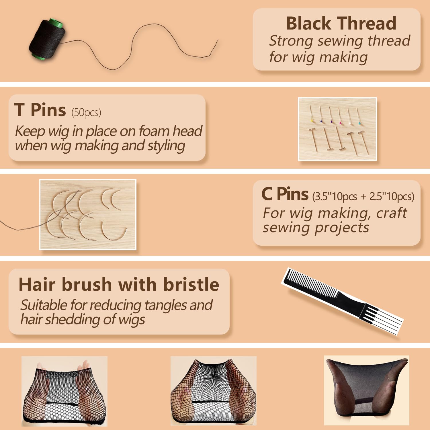 - đăThe Package of Wig HeadăCanvas Block Head*1, Wig Stand Tripod*1, Clamp Stand*1, Wig Caps*4, T Pins*50, 2.5'' C-type Pins*10, 3.5'' C-type pins*10, Hair Brush with Bristle*1, Sewing Thread*1, Clips*5(random color).