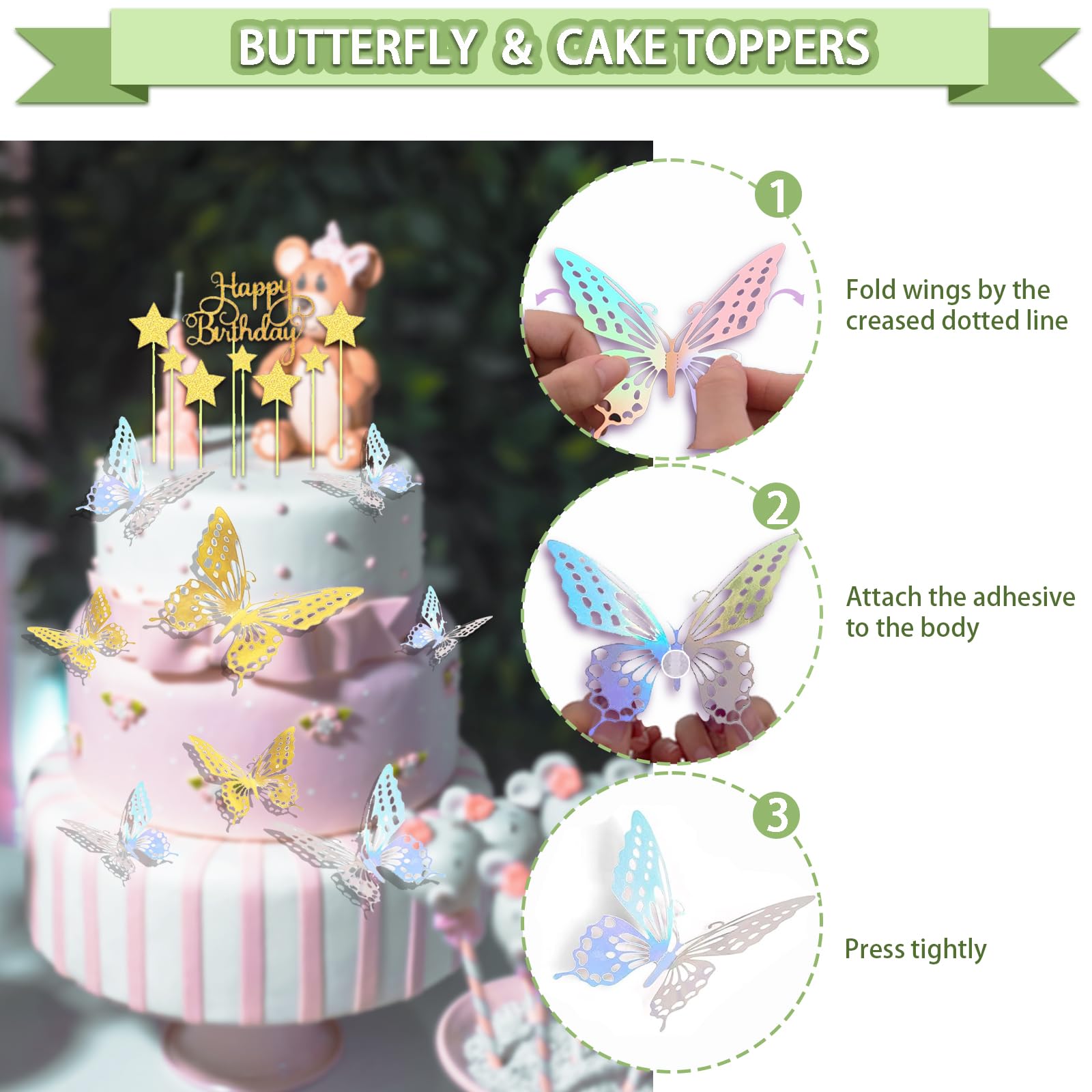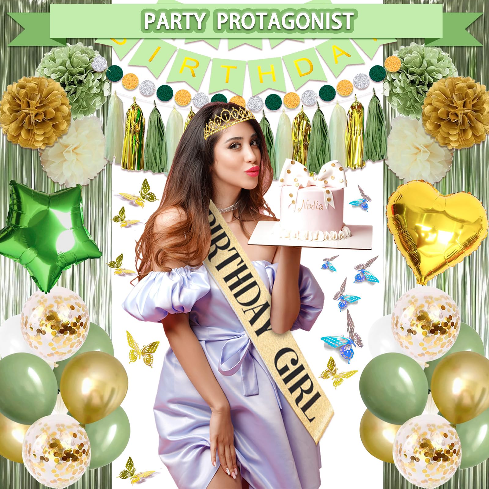 - [DECORATE THE CAKE & PARTY PROTAGONIST]- Our sage green birthday decorations kit contains 1 x big gold birthday cake topper, 7 x pentagram cupcake toppers and 12 x 3D butterfly decorations, perfect for decorating your cake! "BIRTHDAY QUEEN" sash and tiara highlights our party protagonists and enriches the party atmosphere!