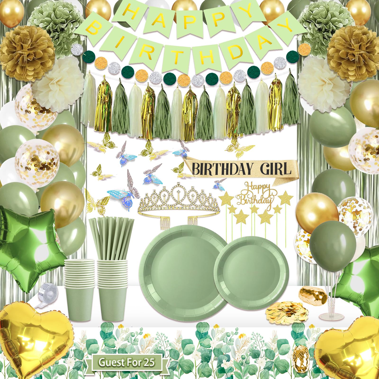 - [All-in-One Party Decoration Set] - This 222 pcs Sage Green Happy Birthday Decorations includes 25 x 9" plates, 25 x 7" plates, 25 x 9 oz cups, 25 sets of straws, 12 x gold butterfly decors, 1 tiara, 1 x sash, 1 x sage green theme tablecloth, 2 x sage green fringe curtain, 8 x "Happy Birthday" cake topper, 4 x foil balloons, 60 x latex balloons, 1 x balloon stand kit, 1 x sage green "HAPPY BIRTHDAY" banner