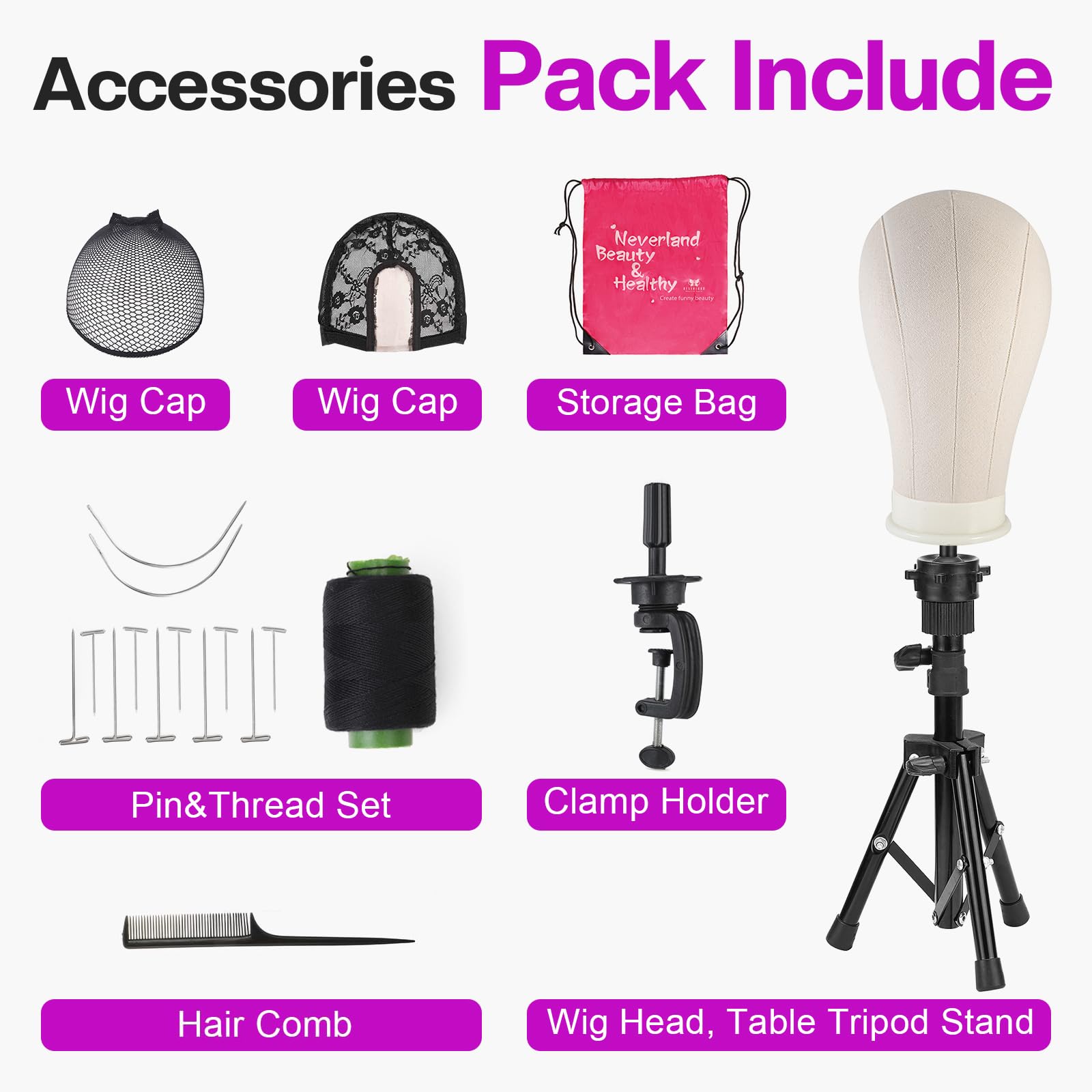 - đăAbout the AccessoriesăPack included canvas head,table tripod stand,wig caps,T-pin set and hair brush.Fully functional, there are the accessories you need to practice making wigs.