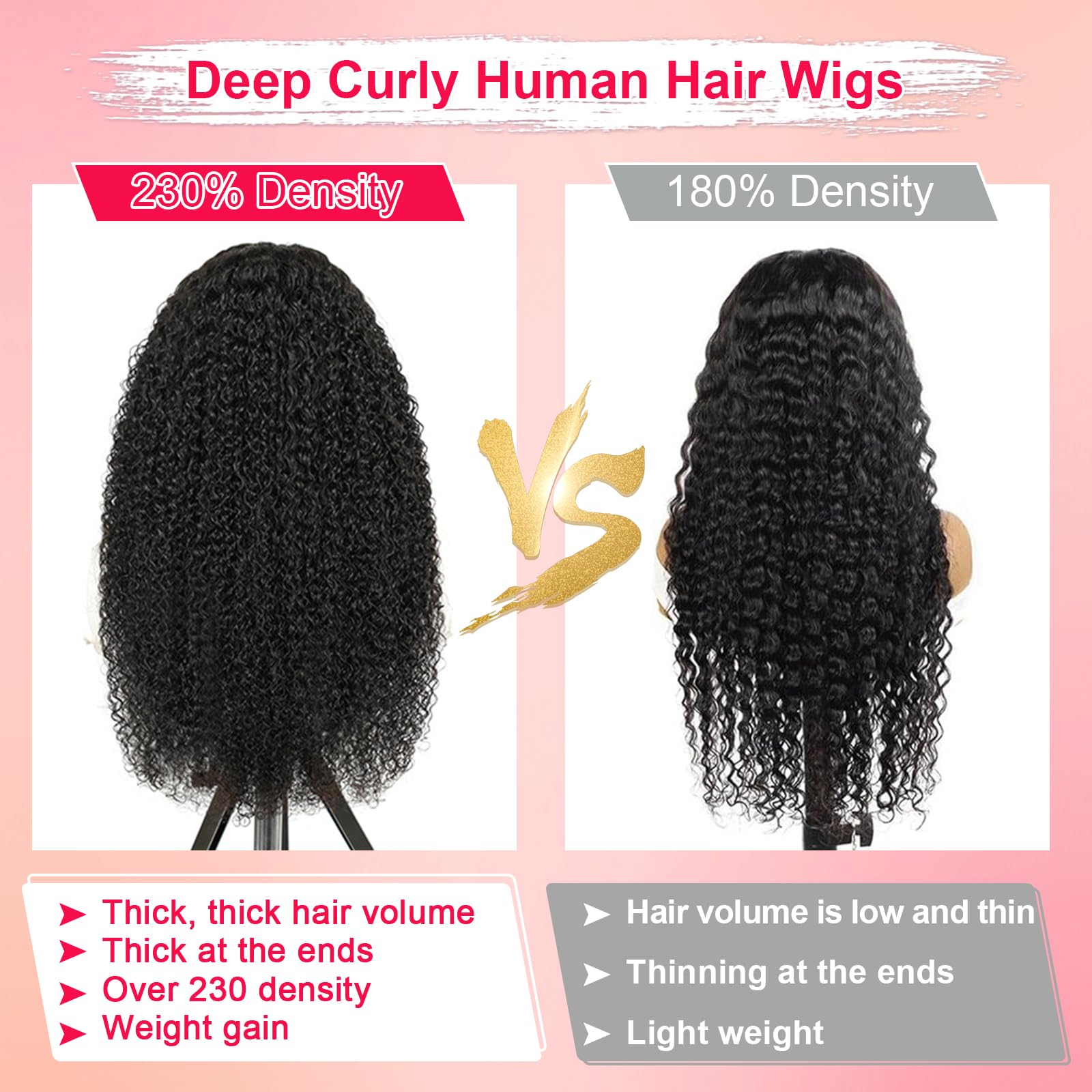 - 230 Density Glueless Wigs Human Hair Quality: 12A deep curly human hair wig 230% density curly human hair wig for black women. Provides a lot of volume, creating a luxurious, thick look that can stand out, no smell, No shedding, True to length and weight, Can be dyed, bleached, premed, straightened and restyled, if care well, Can last longer