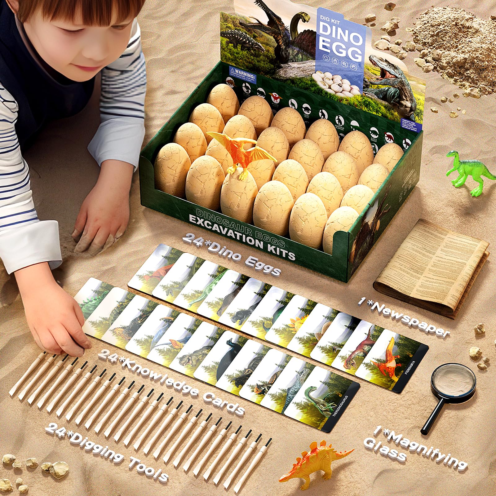 - 【Kit Includes】24 Dino Eggs (with a unique toy dinosaur in each), 24 Chisel/Brushes, 24 full-colored beautiful learning cards(one for each dino),1 magnifying glass,1 newspaper.Great set for individual play or as a group activity. It fascinates children as soon as they pull it out of the box and is a best STEM project.