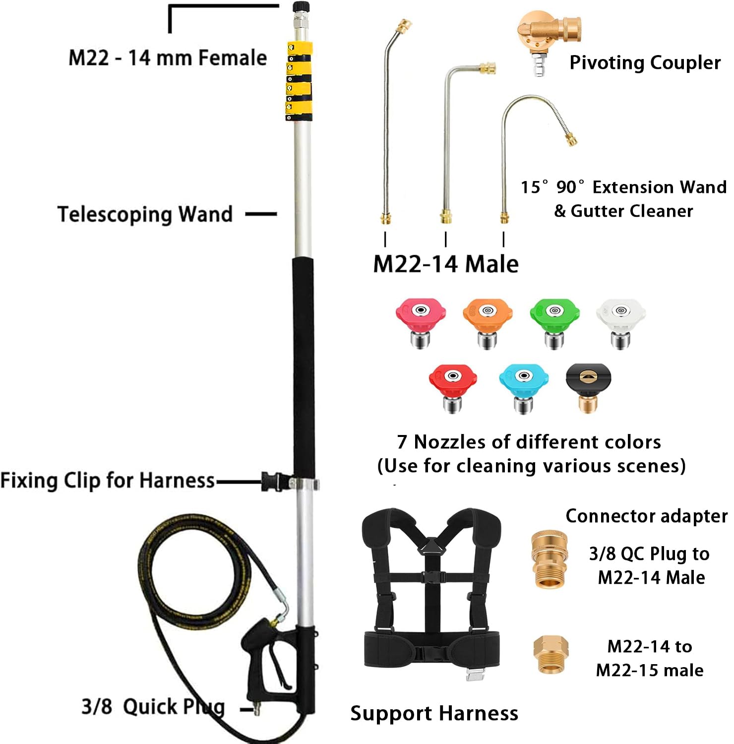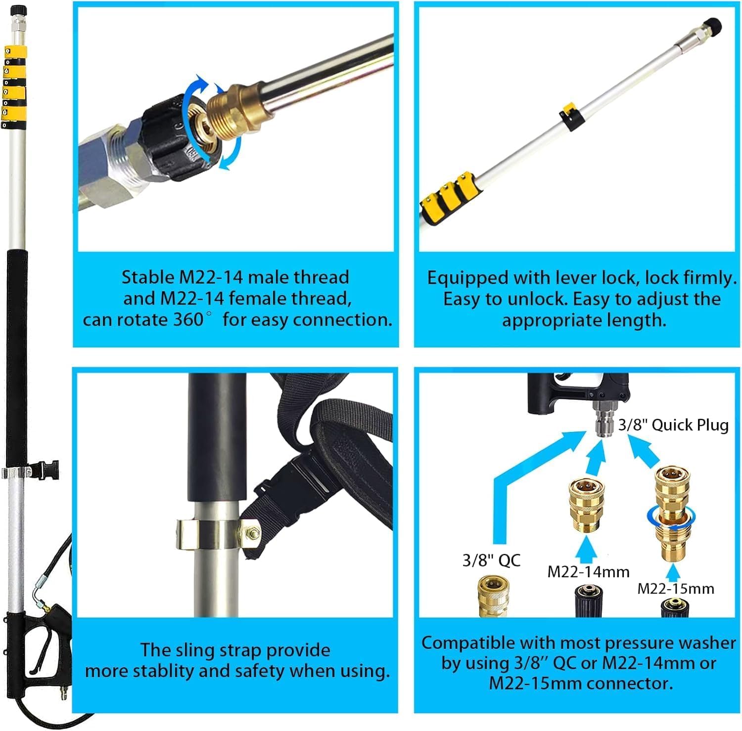 - 【Good Compatibility】With wealth of accessories, the telescopic lance is compatible with most gas-powered and electric commercial grade pressure washers up to 4000 PSI/8GPM. Connect pressure washer hose with 3/8 inch quick-plug inlet fitting, 2 adapters (metric M22-14mm, M22-15mm fitting). No water leaking.