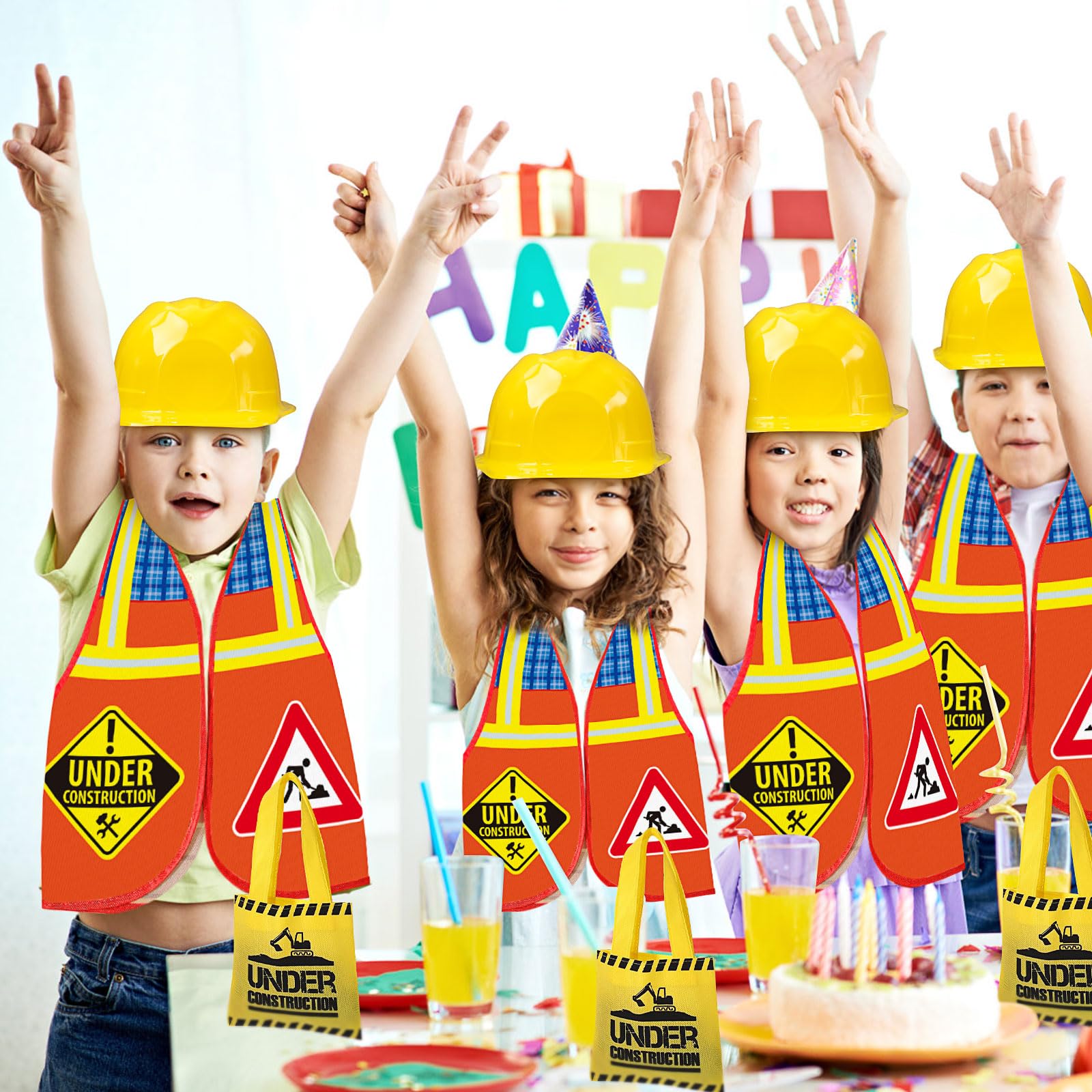 - What's Included: package comes with 8 construction vests, 8 soft plastic construction hats and 8 under construction yellow tote bags, a total of 24 pieces, enough quantity to let more people involve in the dress up party, nurturing your child's imagination. From construction-themed birthday parties to everyday play, they'll learn and have fun simultaneously in their kids' construction worker costumes