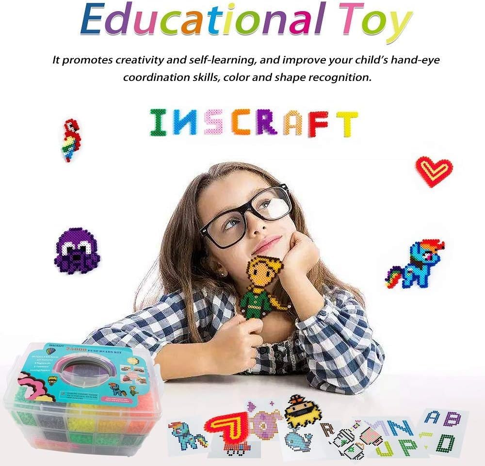 - 25,000 Fuse Beads 26 Colors: 25,000 fuse beads in 26 different colors, including 2 fluorescence color. The colorful beads will help your little one spend time in a creative way and develop its artistic expression and coordination.