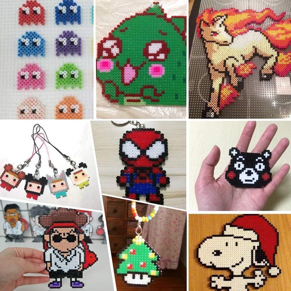 - 127 Full Size Patterns, All The Accessories You Need: Comes in 4 big square pegboards, 1 Heart Pegboards, 1 Flower Pegboards, 10 Ironing paper, 127 full size patterns, 5 tweezers, 10 cute eyes, 5 colorful hooks, 6 jingle bells, 5 tassels, ropes and key rings.