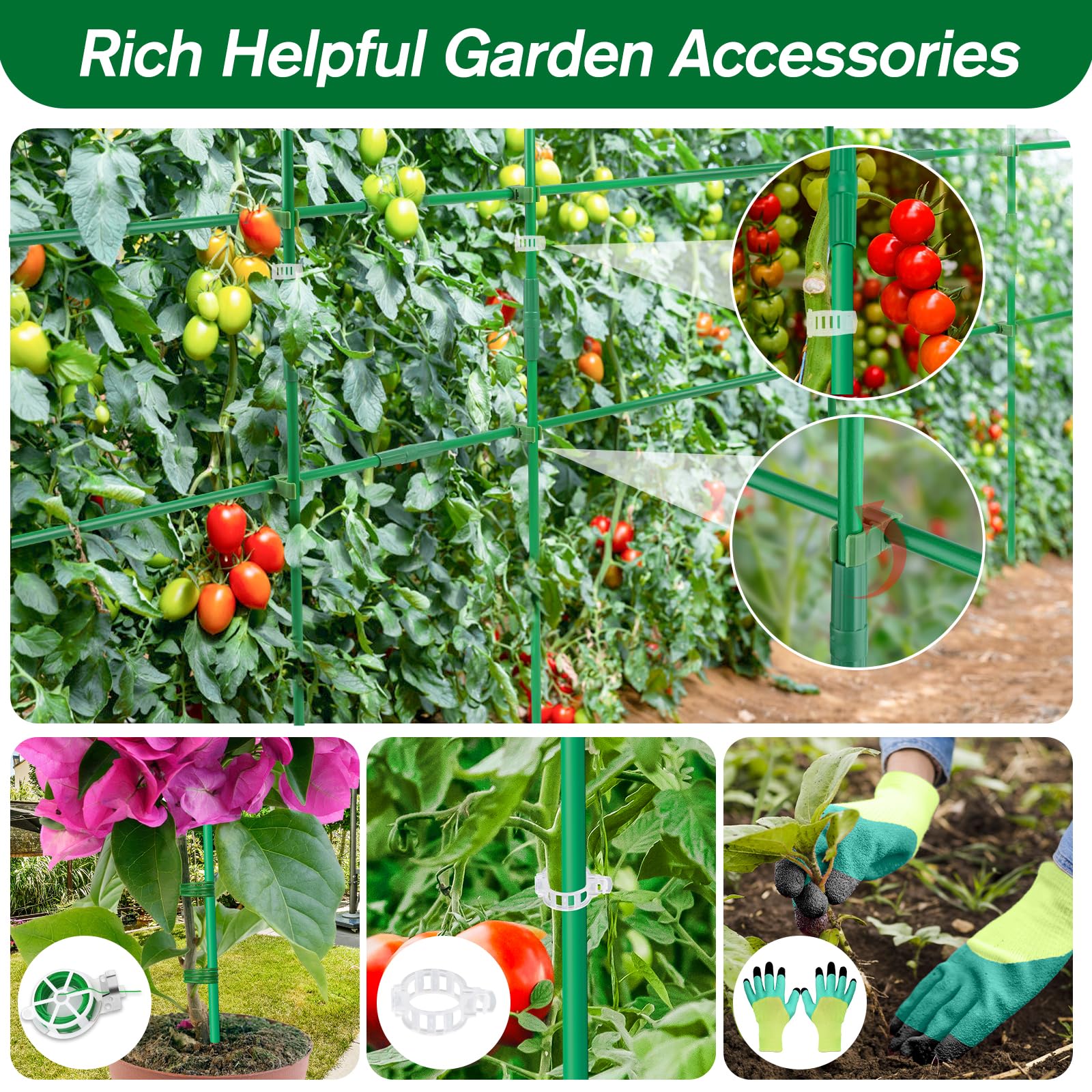 - 【Value Garden Stake Set】Garden tomato stakes kit includes 75 pcs fiberglass stakes with 16" in length and 0.3" in diameter,18 pcs stake arms,50 pcs connectors,40 pcs pointed caps,30 pcs rotatable clips,40 pcs white garden clips,1 pcs garden twist tie,1 pcs garden glove,1 pcs instruction. Garden stake with adjustable size, by using connectors, you can connect two or more garden sticks to obtain the desired length, providing continuous support for plants