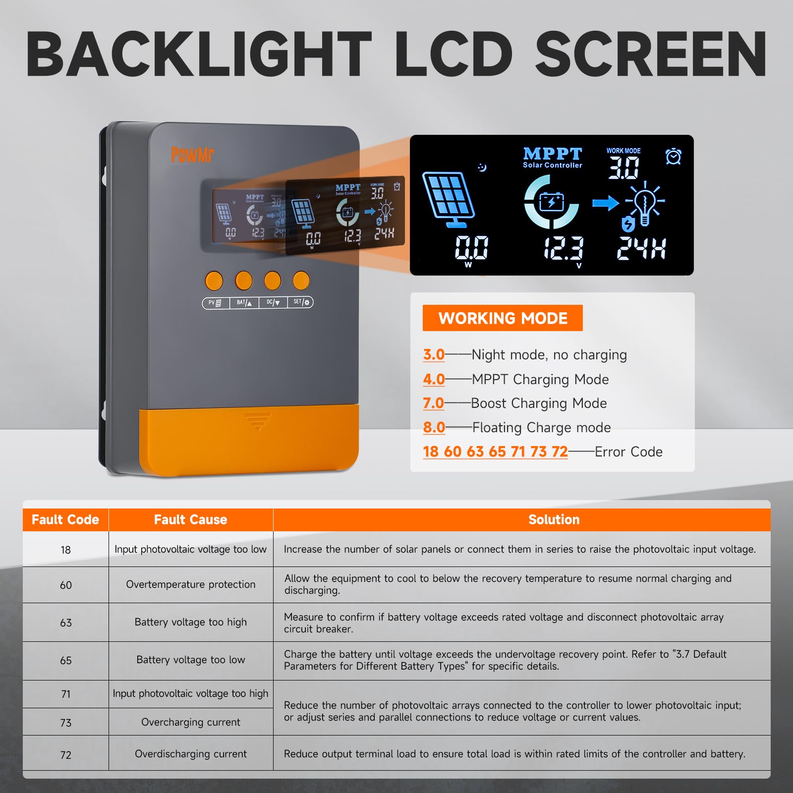 - 【Comprehensive Protection】Equipped with protections against short circuits, overcurrent, and reverse polarity. Its die-cast aluminum construction provides excellent heat dissipation and reduced power consumption. A clear LCD screen with four buttons ensures easy operation, supported by detailed wiring instructions and responsive customer service