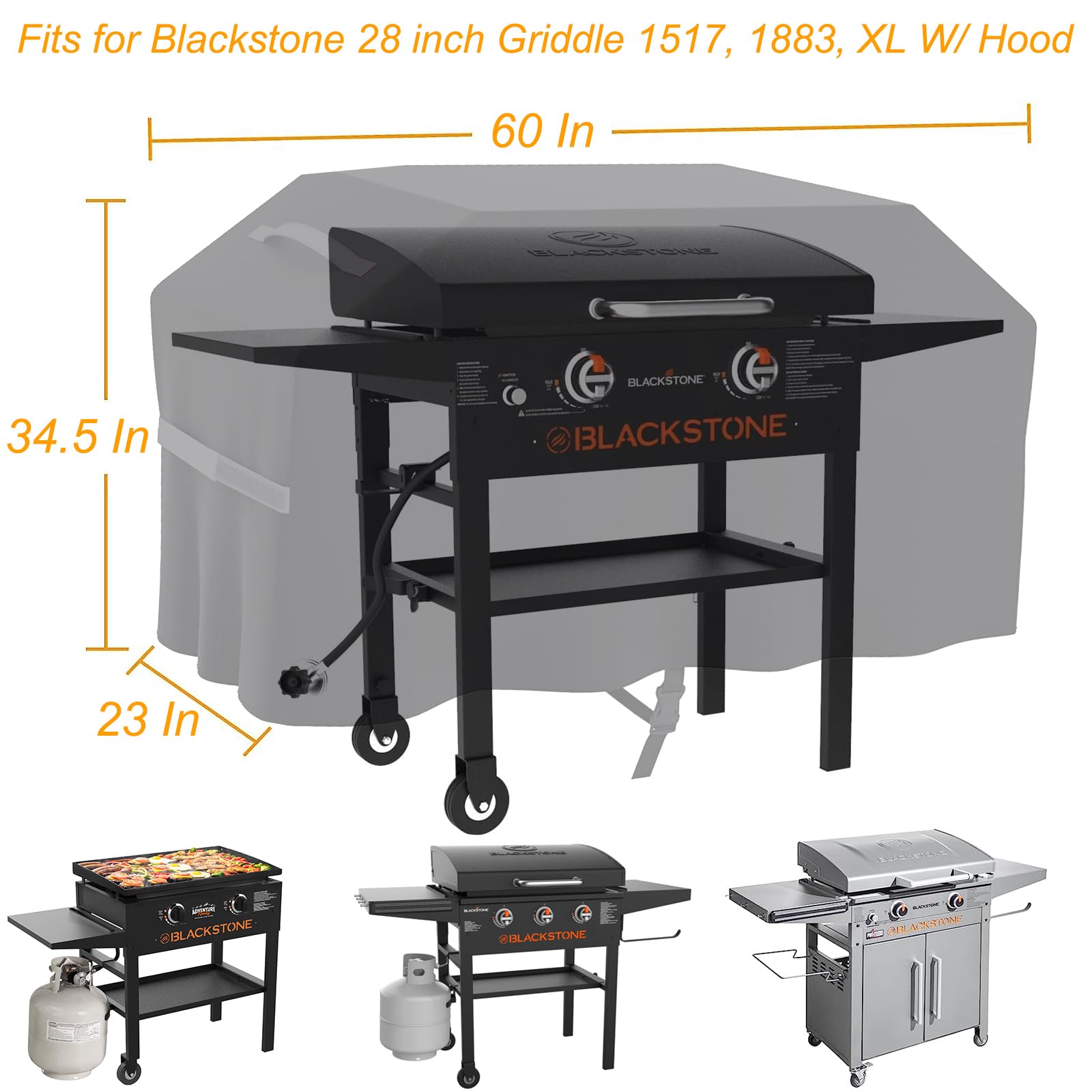- 【Sized for Blackstone 28 inch Griddle】5483 Griddle Cover measures 60"(width)x23"(depth)x34.5"(height) 🔥 1.Fits for Blackstone 1883 Gas Hood & Side Shelves .🔥 2.Fits for Blackstone 28"Griddle with hood (Model 1924,1785,2147,2340,1901,2080,2287 and more).🔥 3.Fits for Blackstone Adventure Ready 2-Burner 28" Outdoor Griddle. 🔥 4.Fits for Blackstone 1853 Flat Top Gas Grill 2 Burner Propane 28" Outdoor Griddle .🔥 5.Fit for Blackstone 28"ProSeries Griddle.