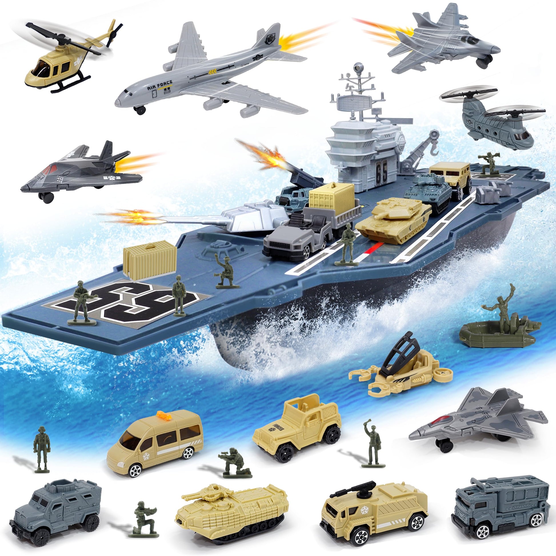 - Super Value Aircraft Carrier Toys Set: Including a large building Aircraft Carrier toy, army vehicles, airplane, helicopters and fighter jets*18, assembled accessories*11, army men action figures*11, containers*2 and sticker*1.